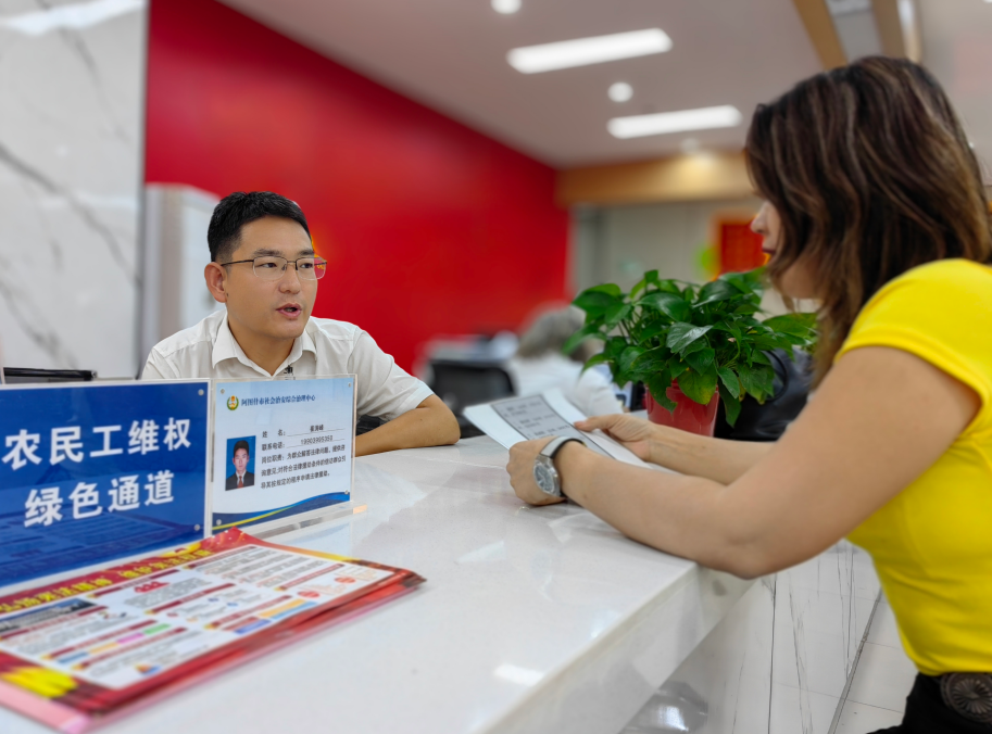 圖為9月21日,阿圖什市綜治中心“農(nóng)民工維權(quán)綠色通道”窗口工作人員正在接待來訪群眾。