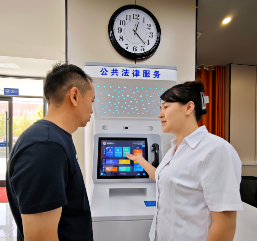 圖為9月21日,阿圖什市綜治中心工作人員向來訪群眾介紹公共法律服務(wù)自助服務(wù)系統(tǒng)功能。