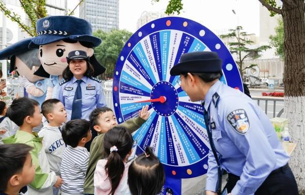 圖為民警通過(guò)趣味轉(zhuǎn)盤(pán)向市南區(qū)悅府幼兒園小朋友普及日常食品安全知識(shí)