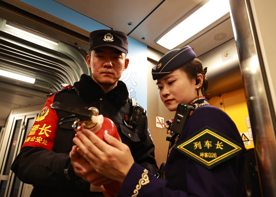 圖為首發(fā)列車乘警張?bào)K昂與列車長共同開展消防安全隱患排查。