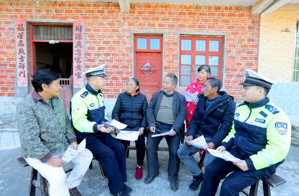 圖為1月14日,民輔警在鈐山鎮(zhèn)田心村向村民宣傳交通安全知識(shí)。