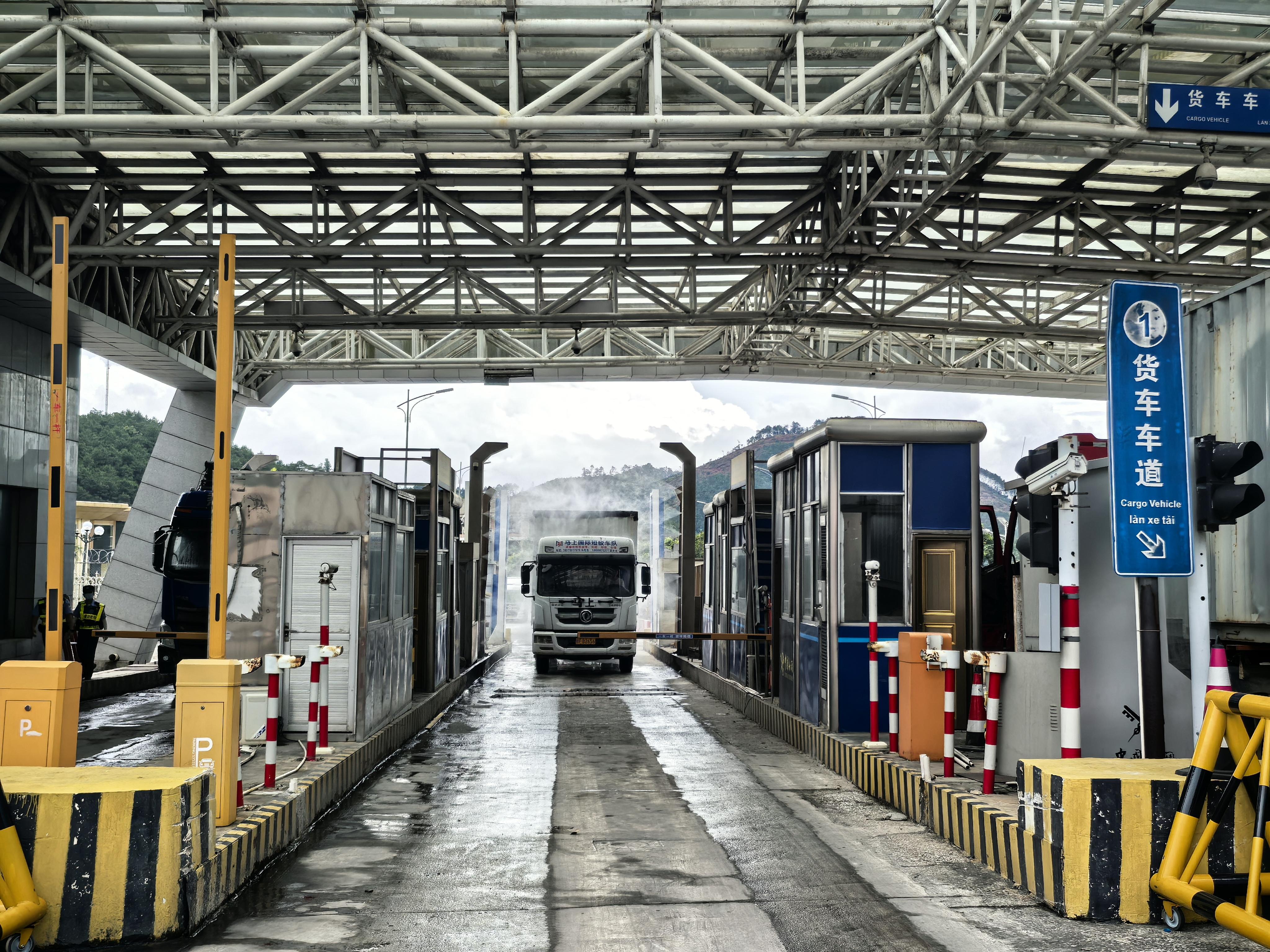 圖為滿載東盟水果的貨運車輛緩緩駛入查驗平臺。