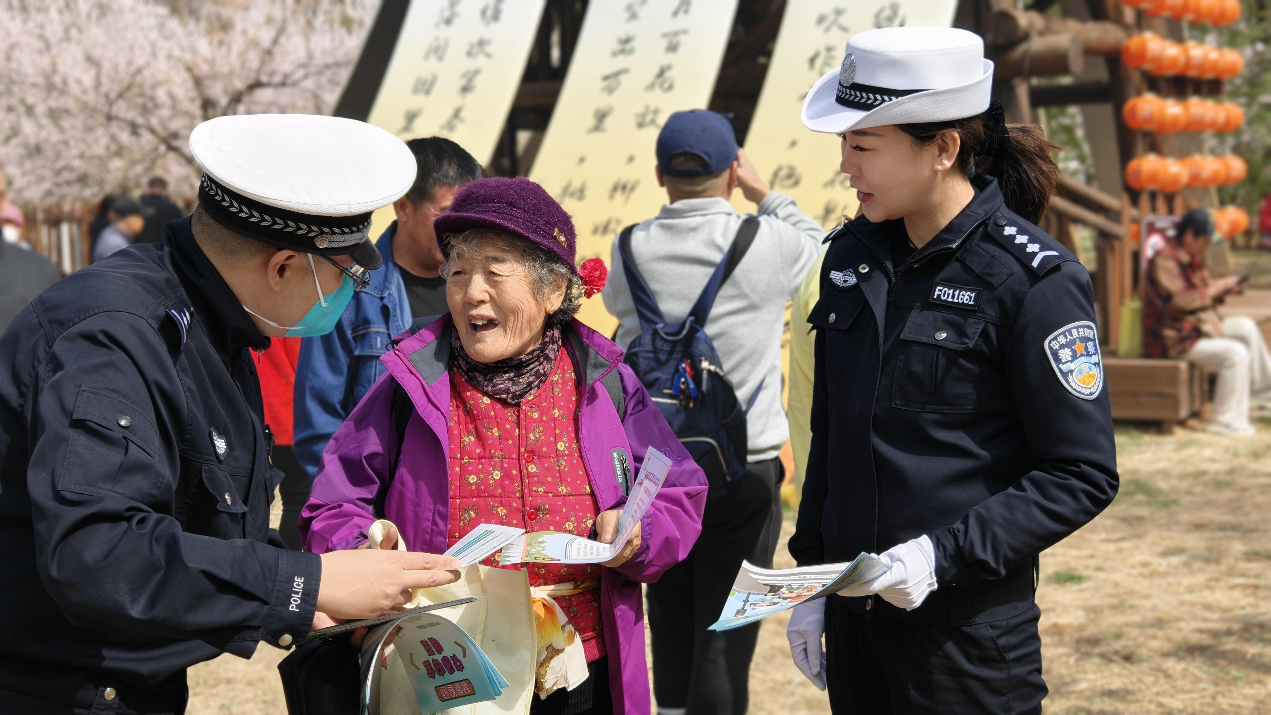 圖為交警為游客發(fā)放宣傳資料并進(jìn)行安全提示。
