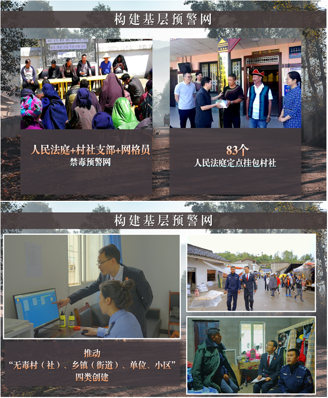 借鑒“楓橋經驗”,構建“人民法庭+村社支部+網格員”禁毒預警模式,全州83個人民法庭定點掛包村社、包干到人,定期走村入戶教導群眾防毒,培訓督導網格員落實毛發(fā)、污水檢測,從源頭上預防和減少涉毒違法犯罪,推動“無毒村(社)、鄉(xiāng)鎮(zhèn)(街道)、單位、小區(qū)”四類創(chuàng)建。
