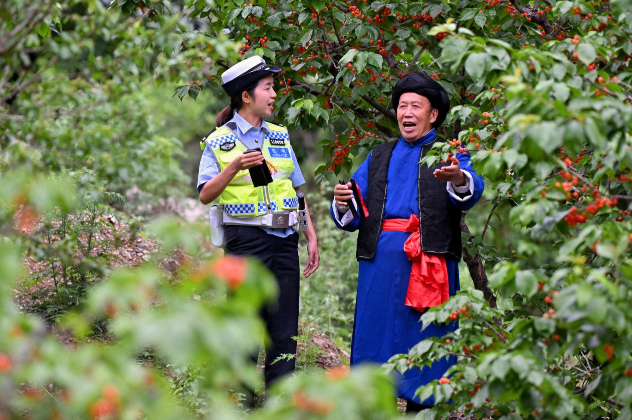 “所有開車駕駛員,自我告誡重三件。發(fā)動(dòng)車輛開車前,重要部位查一遍。發(fā)動(dòng)車輛開車前,排除隱患保安全。所有開車駕駛員,發(fā)動(dòng)車輛開車前,系安全帶要規(guī)范。安全行駛最重要,平平安安回家園?!?月25日下午,正值2024年瀘定紅櫻桃采摘體驗(yàn)季推薦會(huì)在四川省甘孜州瀘定縣冷磧鎮(zhèn)杵坭櫻桃谷即將開幕之際,在果實(shí)累累的杵坭村櫻桃樹下,有“微笑交警”之譽(yù)的劉格蘆會(huì)同省級(jí)非物質(zhì)文化遺產(chǎn)瀘定山歌傳承人吳全清老人,冒著細(xì)雨一道錄制《開車自我告誡重三件》快板說唱視頻,用于在線上“平安甘孜”傳播護(hù)航五一小長(zhǎng)假。