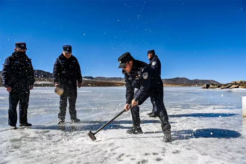 中午時分,土登郎加又和大家一起前往警務(wù)站不遠(yuǎn)處的措拉湖里取水,警務(wù)站不通水,大家的生活用水都是從這個海子里提取的。每到冬季,海子的水面就會結(jié)冰,堅(jiān)固的冰面能夠通行汽車。只有到了中午,氣溫開始回升,冰層融化了一些,大家找到結(jié)冰薄一點(diǎn)的地方,使勁用鐵錘鑿開一個窟窿,才能取到冰面下的水。