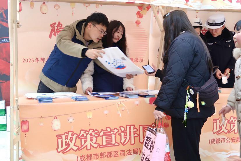 活動(dòng)現(xiàn)場,非遺川劇變臉、猜燈謎、非遺蜀繡、非遺捏面人、非遺糖畫等節(jié)目吸引眾多居民駐足觀看。普法員為觀看節(jié)目的群眾送上交通安全、防范電信網(wǎng)絡(luò)詐騙、聘請律師指南等普法讀本,結(jié)合典型案例耐心解答群眾的疑問,并介紹12348熱線、“成都司法通”小程序等免費(fèi)法律咨詢方式,引導(dǎo)群眾切實(shí)掌握獲取公共法律服務(wù)的方式,提升法治意識、增強(qiáng)自我保護(hù)能力。