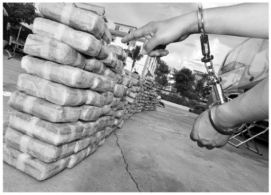6月7日,云南西雙版納邊境管理支隊破獲一起特大運輸毒品案,在一輛大巴車上查獲毒品可疑物139.774公斤。圖為嫌疑人指認所運輸?shù)亩酒房梢晌铩7ㄖ迫請笥浾?石飛法制網(wǎng)通訊員 韋立鵬 攝