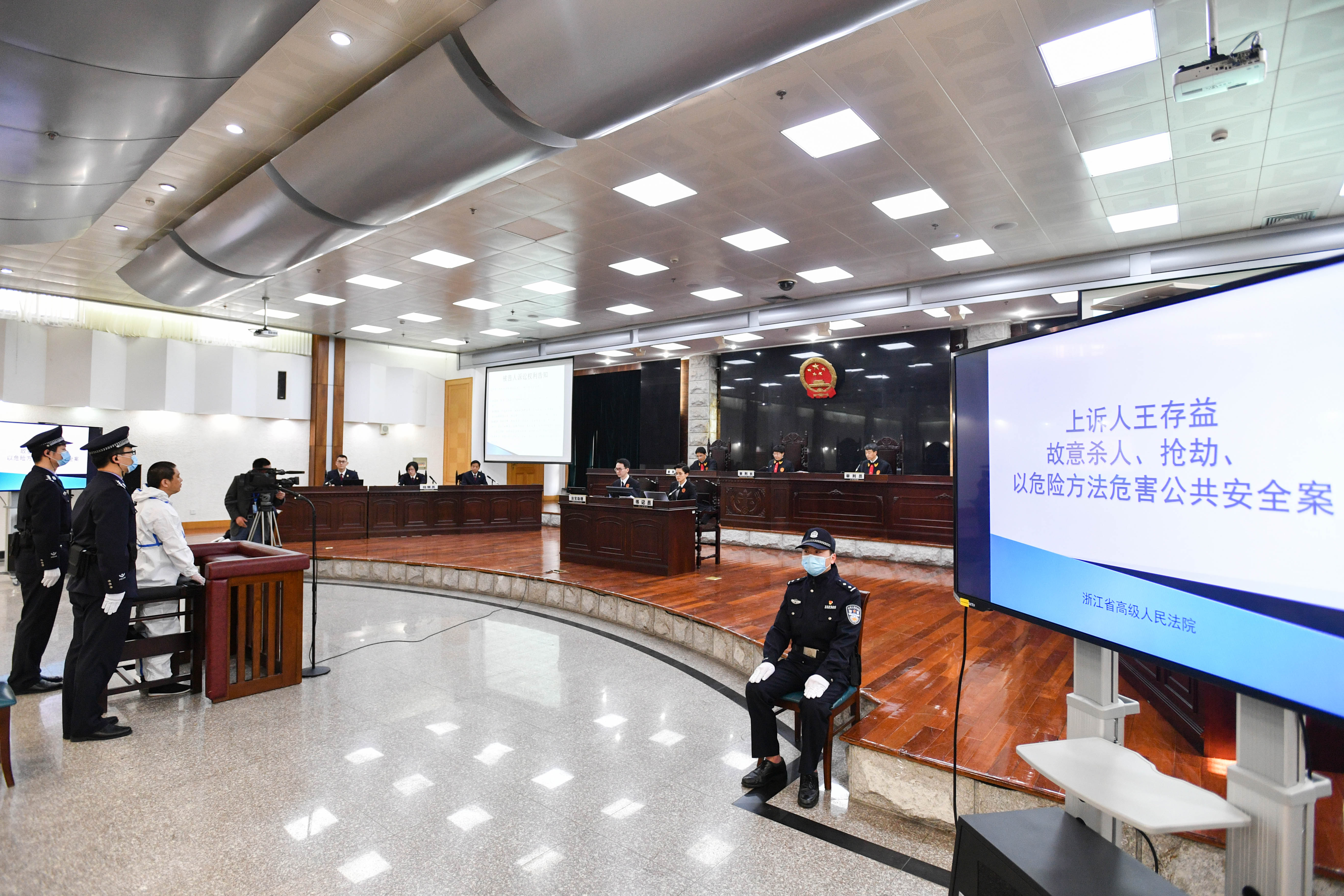 今年4月17日上午,浙江省高級人民法院二審公開開庭審理了王存益故意殺人、搶劫、以危險方法危害公共安全案。浙江省人民檢察院檢察長、二級大檢察官賈宇與檢察員黃茜霞、李明出庭履行職務,浙江高院副院長陳志君擔任審判長,法官梁健、侯天柱擔任審判員,上訴人王存益及其二審辯護人出庭參加訴訟。