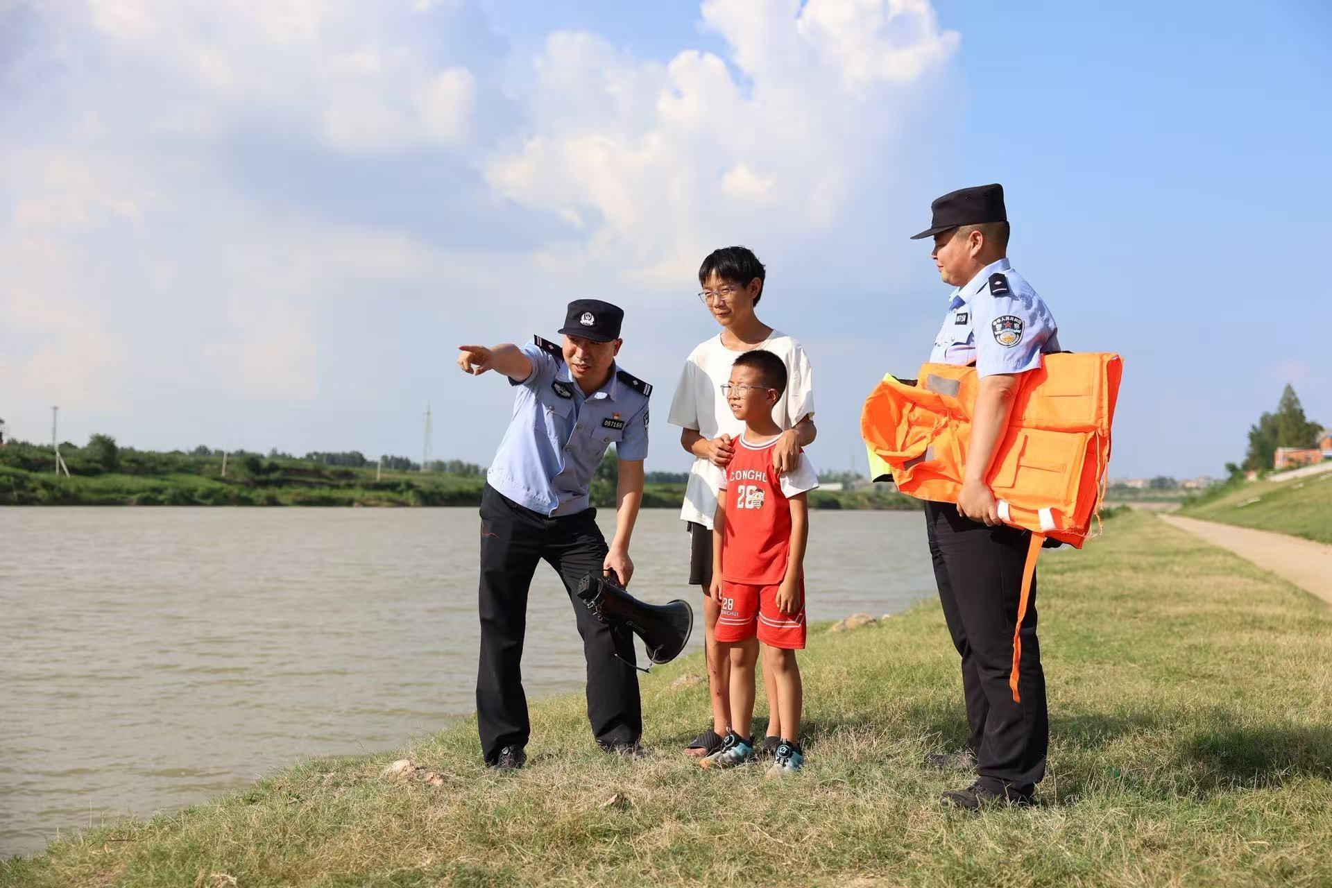 7月18日,湖北省襄陽市公安局襄州區(qū)分局雙溝派出所民警輔警在轄區(qū)內開展防溺水巡查、宣傳勸導工作。圖為民輔警在水域邊向群眾宣傳防溺水常識。