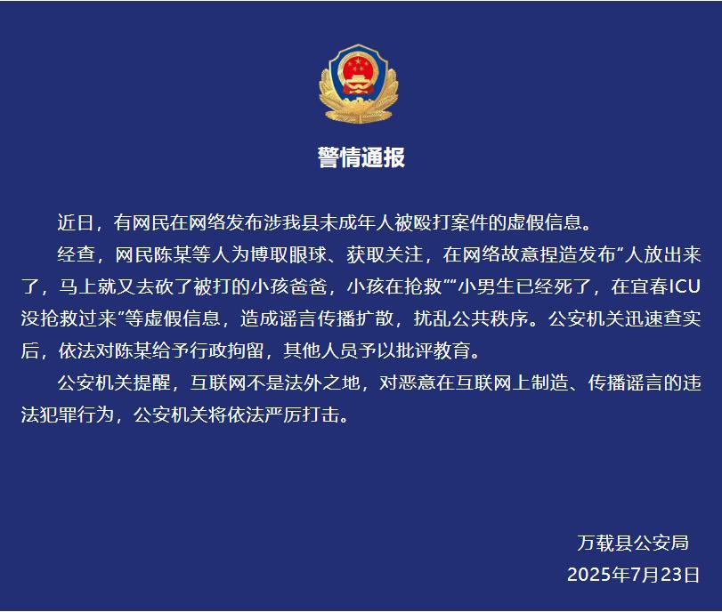 7月23日下午,萬載縣公安局發(fā)布警情通報稱,網(wǎng)民陳某等人為博取眼球、獲取關(guān)注,在網(wǎng)絡(luò)故意捏造發(fā)布“小男生已經(jīng)死了,在宜春ICU沒搶救過來”等虛假信息,公安機關(guān)依法對陳某給予行政拘留,其他人員予以批評教育。