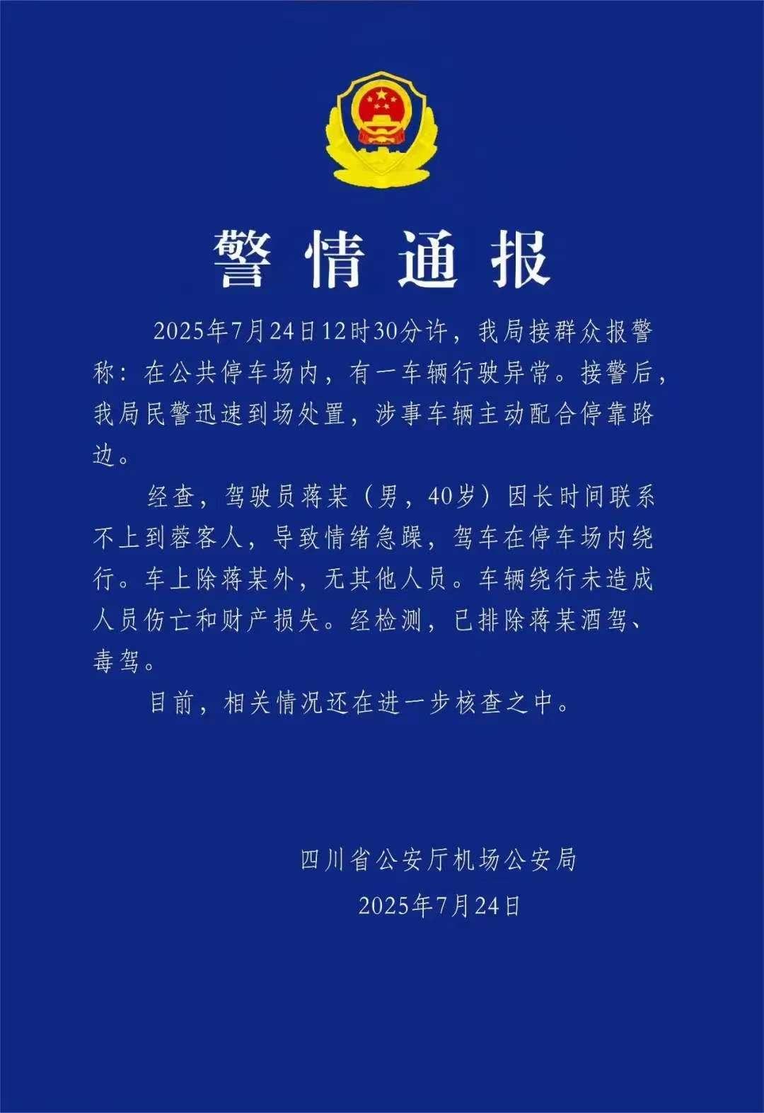 經(jīng)查,駕駛員蔣某(男,40歲)因長(zhǎng)時(shí)間聯(lián)系不上到蓉客人,導(dǎo)致情緒急躁,駕車(chē)在停車(chē)場(chǎng)內(nèi)繞行。車(chē)上除蔣某外,無(wú)其他人員。車(chē)輛繞行未造成人員傷亡和財(cái)產(chǎn)損失。經(jīng)檢測(cè),已排除蔣某酒駕、毒駕。