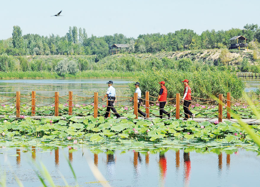 圖為8月19日,瑪納斯縣公安局蘭州灣鎮(zhèn)派出所八家戶(hù)警務(wù)室民警與瑪納斯國(guó)家濕地公園管委會(huì)工作人員一同在瑪納斯國(guó)家濕地公園開(kāi)展巡邏。李進(jìn)福 攝