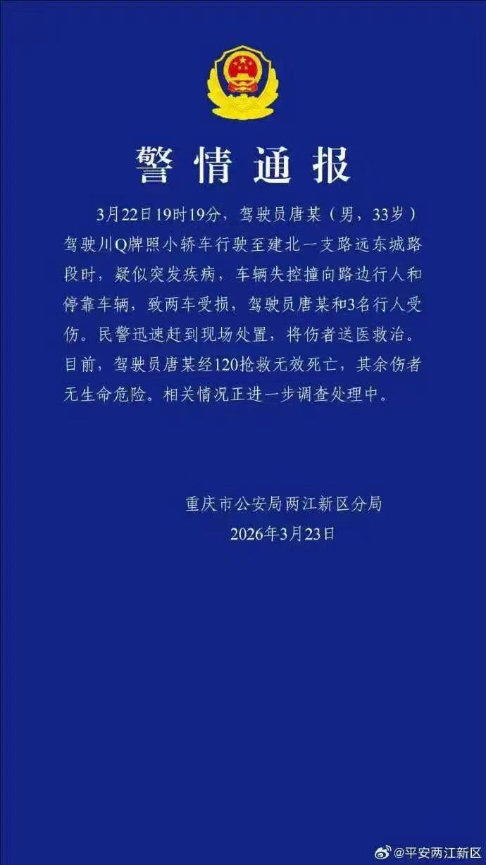 2026年3月23日,重慶市公安局兩江新區(qū)分局就“觀音橋轎車(chē)撞傷路人”發(fā)布警情通報(bào)。