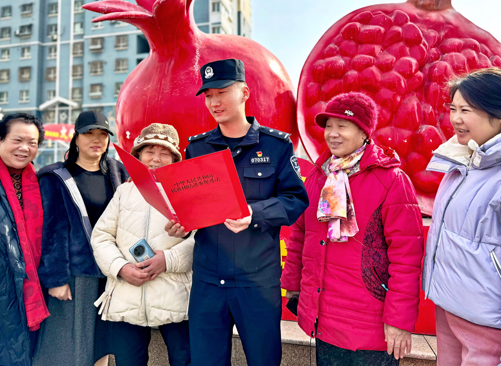 就在不遠(yuǎn)處的廣場(chǎng)上,民警龐振超也被幾位居民圍住。他手里拿著一沓普法宣傳冊(cè),講的卻是身邊的事兒:“咱們鄰居們之間平時(shí)互相幫襯,和和氣氣的,日子才能越過(guò)越好。”