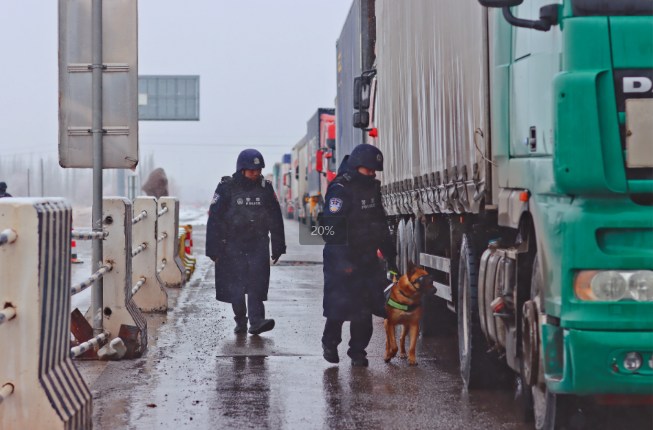 3月20日,新疆克州邊境管理支隊(duì)康蘇邊境檢查站民警頂風(fēng)冒雪查驗(yàn)出入境貿(mào)易貨車,面對惡劣天氣,民警堅(jiān)守崗位,確保貨運(yùn)車輛順利通關(guān)。
