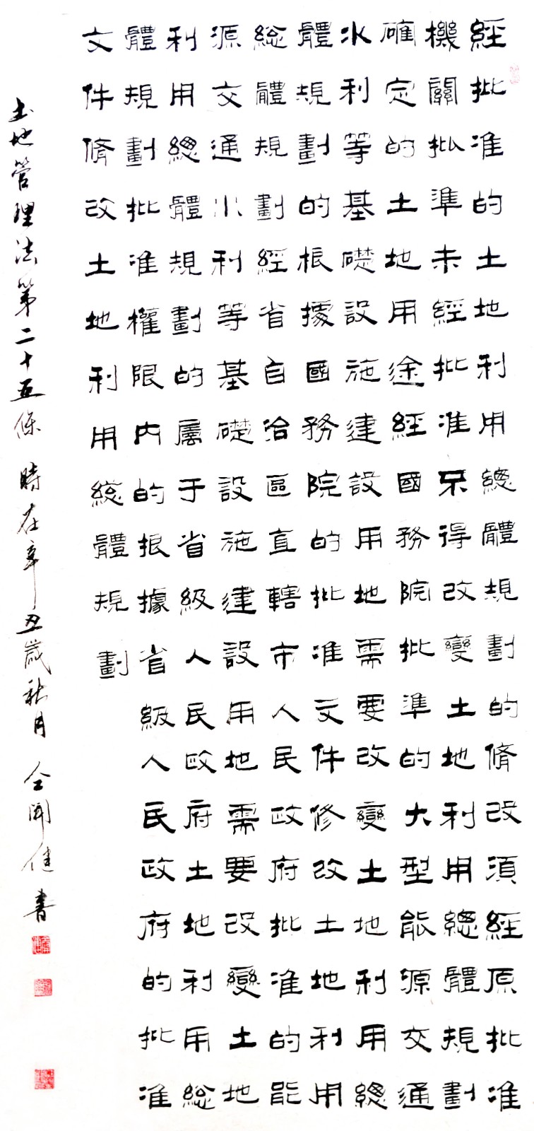 繼1600余位書法家參與書寫《中華人民共和國(guó)民法典》全部1260條法條之后,法治日?qǐng)?bào)社聯(lián)合自然資源部法規(guī)司、自然資源部書畫研究會(huì)和北京昌平書法家協(xié)會(huì),將筆端對(duì)準(zhǔn)土地管理“一法一條例”,即《中華人民共和國(guó)土地管理法》和《中華人民共和國(guó)土地管理法實(shí)施條例》。