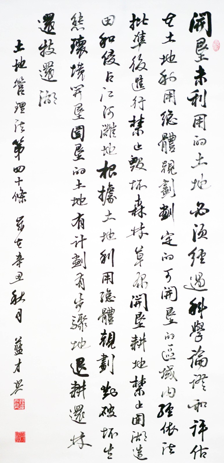 繼1600余位書法家參與書寫《中華人民共和國民法典》全部1260條法條之后,法治日報(bào)社聯(lián)合自然資源部法規(guī)司、自然資源部書畫研究會(huì)和北京昌平書法家協(xié)會(huì),將筆端對準(zhǔn)土地管理“一法一條例”,即《中華人民共和國土地管理法》和《中華人民共和國土地管理法實(shí)施條例》。
