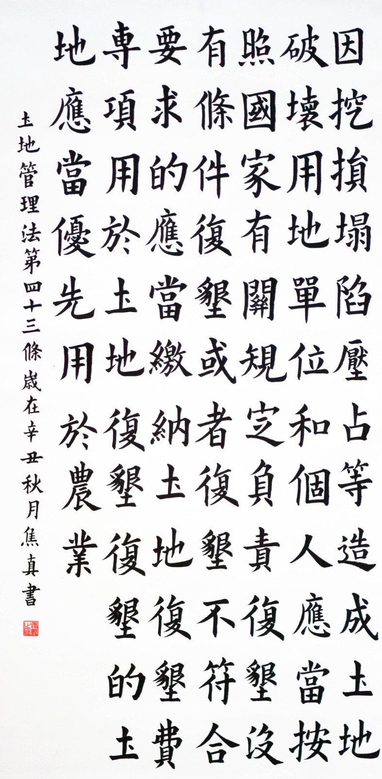繼1600余位書法家參與書寫《中華人民共和國民法典》全部1260條法條之后,法治日報社聯(lián)合自然資源部法規(guī)司、自然資源部書畫研究會和北京昌平書法家協(xié)會,將筆端對準(zhǔn)土地管理“一法一條例”,即《中華人民共和國土地管理法》和《中華人民共和國土地管理法實(shí)施條例》。