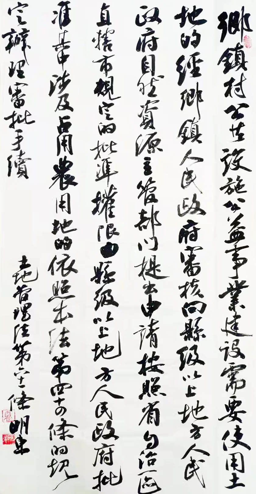 繼1600余位書法家參與書寫《中華人民共和國民法典》全部1260條法條之后,法治日報(bào)社聯(lián)合自然資源部法規(guī)司、自然資源部書畫研究會和北京昌平書法家協(xié)會,將筆端對準(zhǔn)土地管理“一法一條例”,即《中華人民共和國土地管理法》和《中華人民共和國土地管理法實(shí)施條例》。