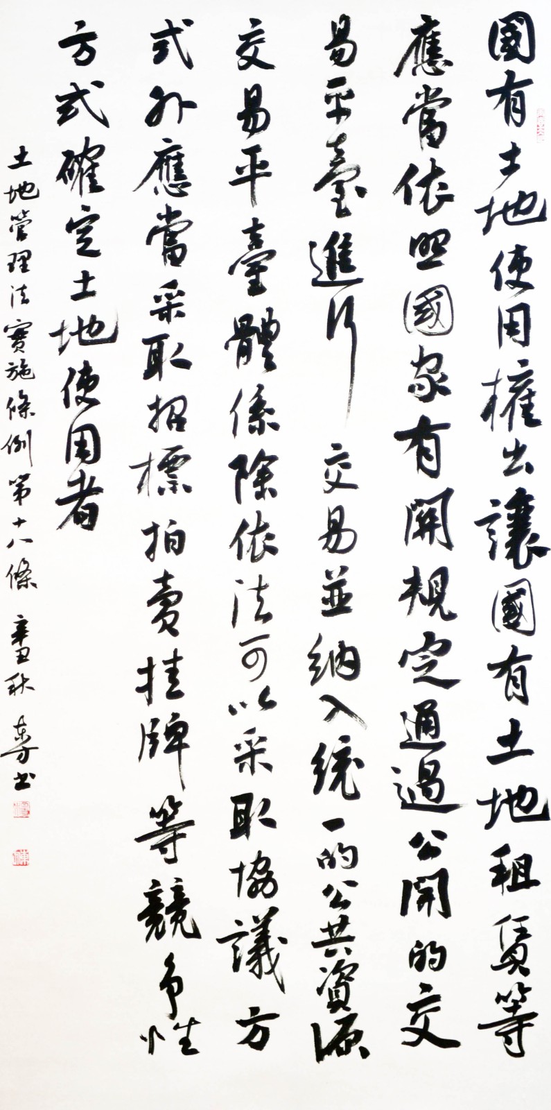繼1600余位書法家參與書寫《中華人民共和國民法典》全部1260條法條之后,法治日報社聯(lián)合自然資源部法規(guī)司、自然資源部書畫研究會和北京昌平書法家協(xié)會,將筆端對準土地管理“一法一條例”,即《中華人民共和國土地管理法》和《中華人民共和國土地管理法實施條例》。