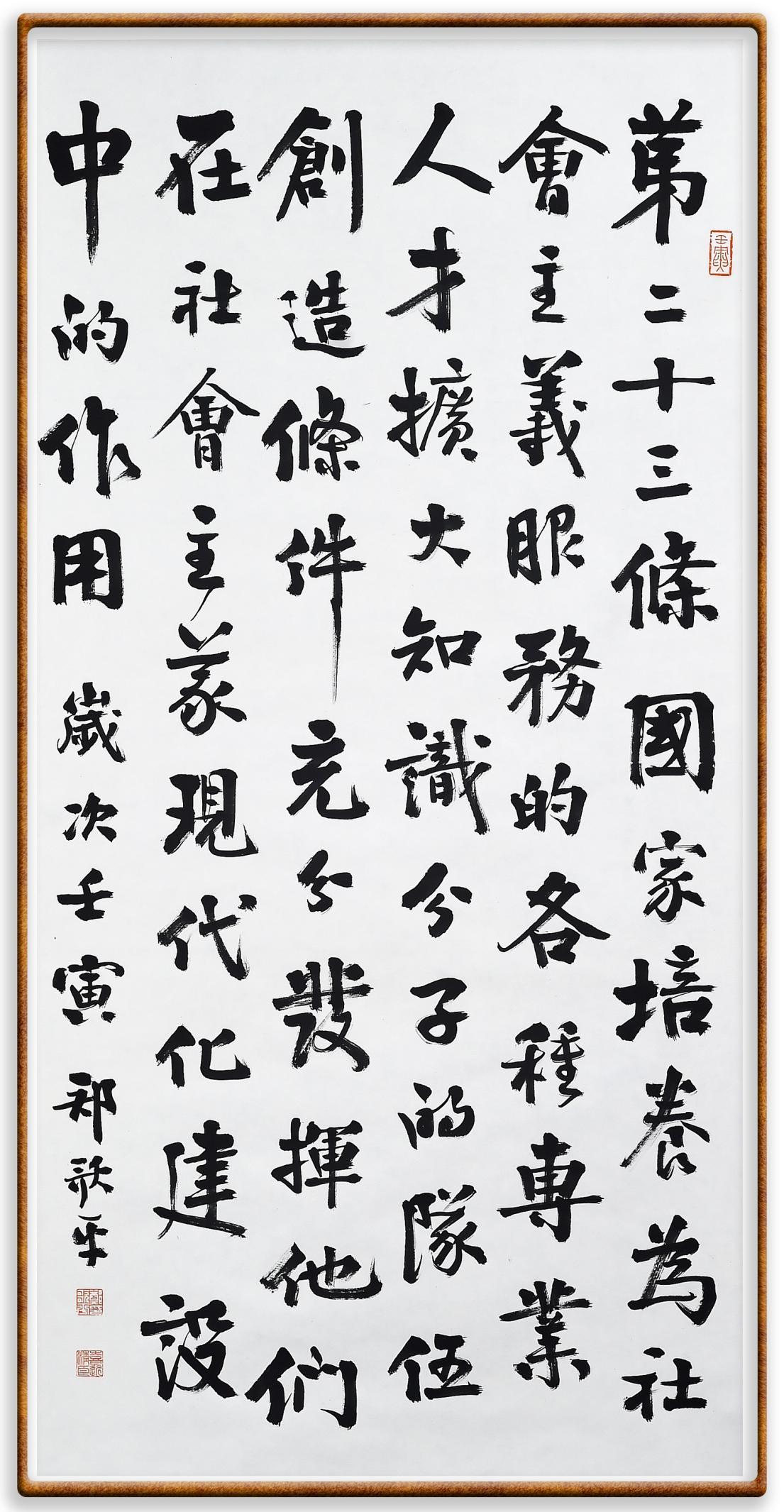 繼《中華人民共和國(guó)民法典》《中華人民共和國(guó)土地管理法》《中華人民共和國(guó)土地管理法實(shí)施條例》《中華人民共和國(guó)法律援助法》之后,法治日?qǐng)?bào)社聯(lián)合北京市司法局、北京市書(shū)法家協(xié)會(huì),將筆端對(duì)準(zhǔn)《中華人民共和國(guó)憲法》和《中華人民共和國(guó)行政處罰法》。