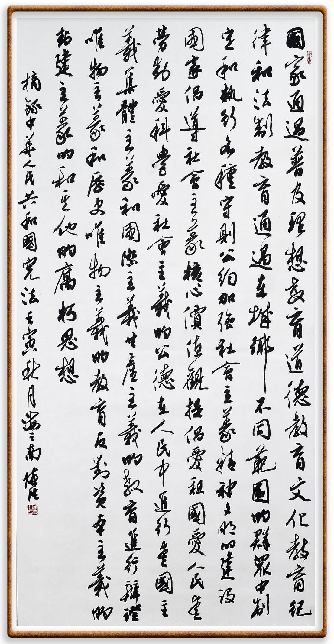 繼《中華人民共和國(guó)民法典》《中華人民共和國(guó)土地管理法》《中華人民共和國(guó)土地管理法實(shí)施條例》《中華人民共和國(guó)法律援助法》之后,法治日?qǐng)?bào)社聯(lián)合北京市司法局、北京市書(shū)法家協(xié)會(huì),將筆端對(duì)準(zhǔn)《中華人民共和國(guó)憲法》和《中華人民共和國(guó)行政處罰法》。