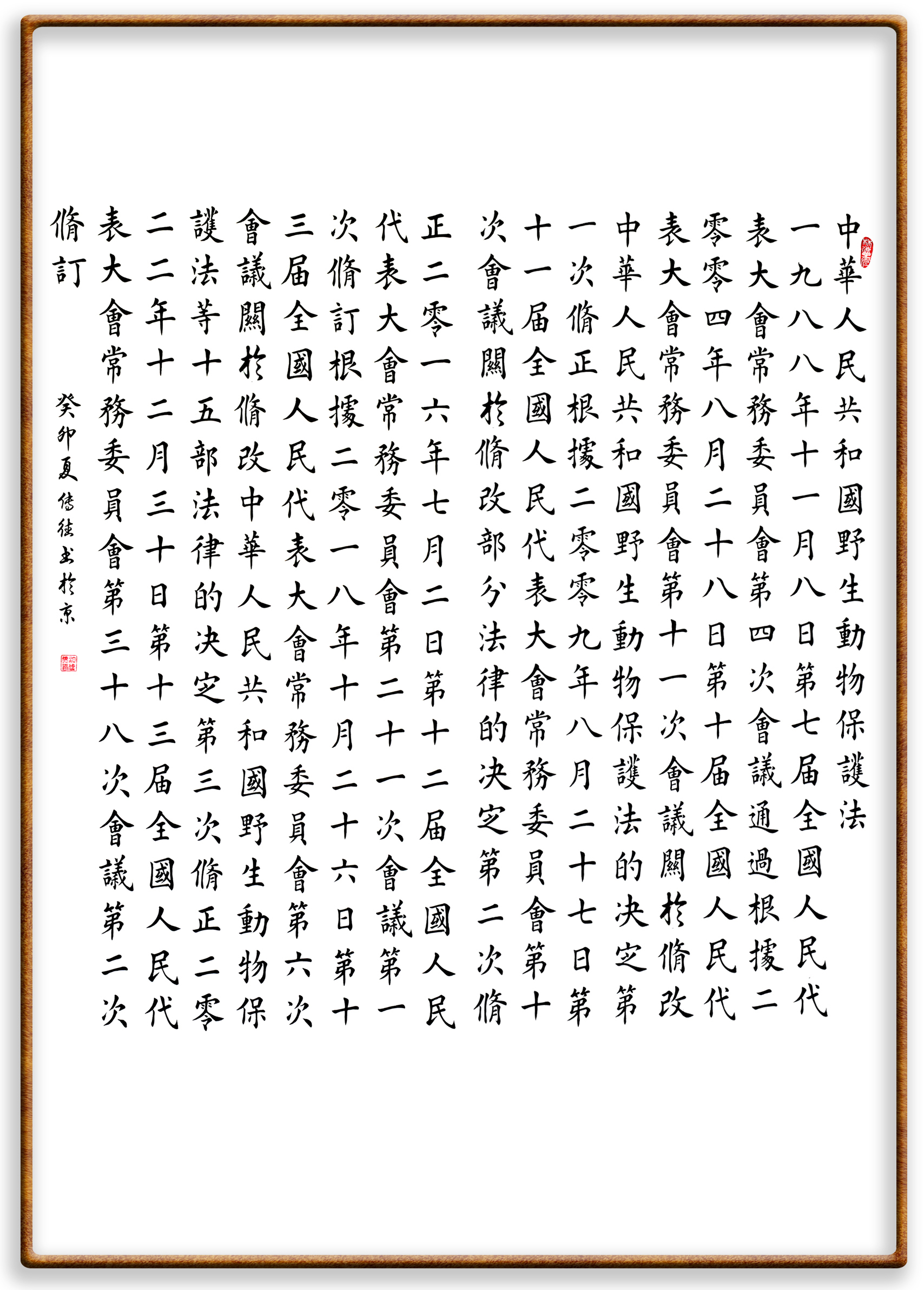 野生動物保護(hù)法修訂歷程 (1988年11月8日第七屆全國人民代表大會常務(wù)委員會第四次會議通過 根據(jù)2004年8月28日第十屆全國人民代表大會常務(wù)委員會第十一次會議《關(guān)于修改〈中華人民共和國野生動物保護(hù)法〉的決定》第一次修正 根據(jù)2009年8月27日第十一屆全國人民代表大會常務(wù)委員會第十次會議《關(guān)于修改部分法律的決定》第二次修正 2016年7月2日第十二屆全國人民代表大會常務(wù)委員會第二十一次會議第一次修訂 根據(jù)2018年10月26日第十三屆全國人民代表大會常務(wù)委員會第六次會議《關(guān)于修改〈中華人民共和國野生動物保護(hù)法〉等十五部法律的決定》第三次修正 2022年12月30日第十三屆全國人民代表大會常務(wù)委員會第三十八次會議第二次修訂)
