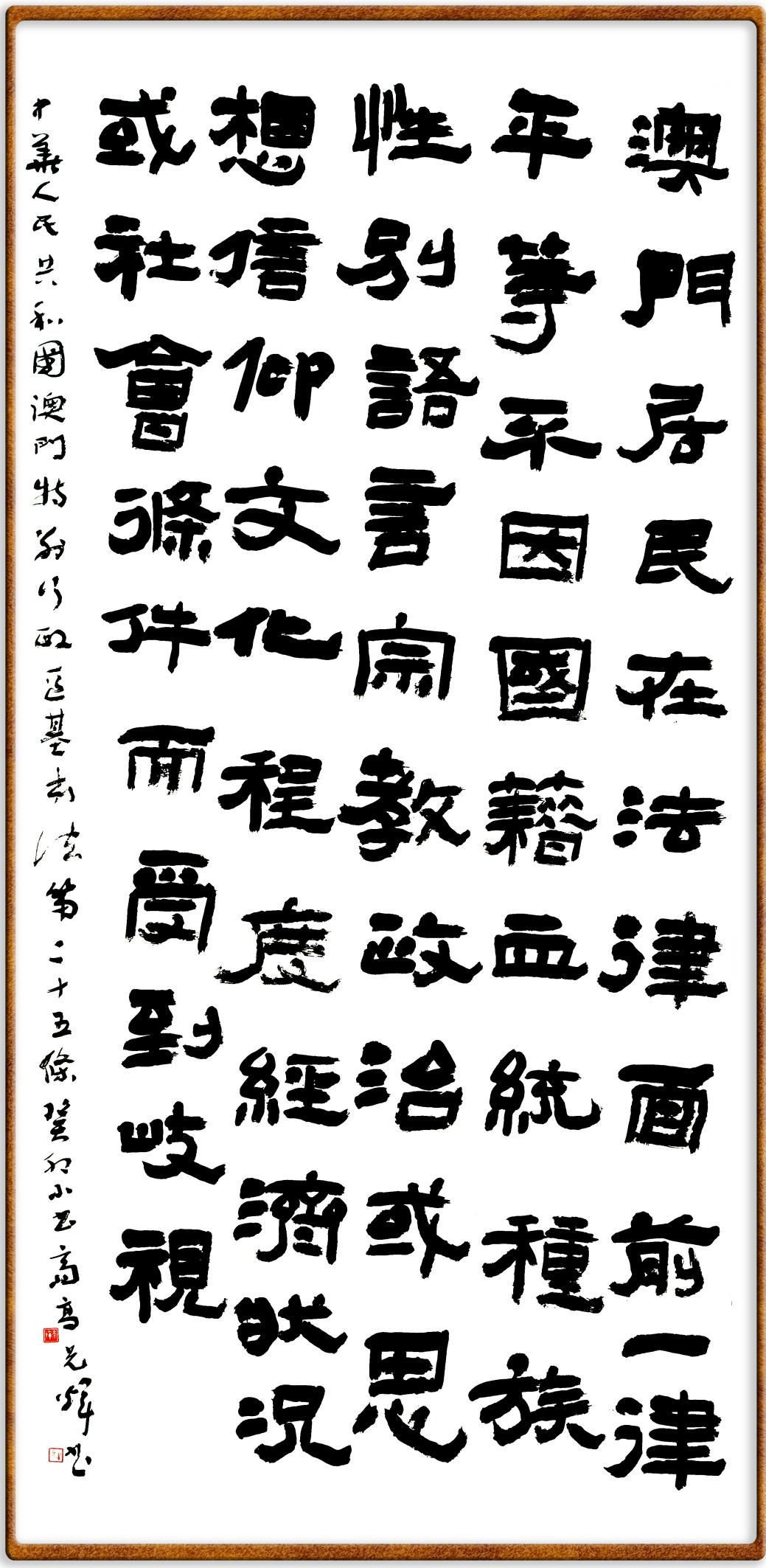 澳門基本法第二十五條 澳門居民在法律面前一律平等,不因國籍、血統(tǒng)、種族、性別、語言、宗教、政治或思想信仰、文化程度、經(jīng)濟(jì)狀況或社會條件而受到歧視。