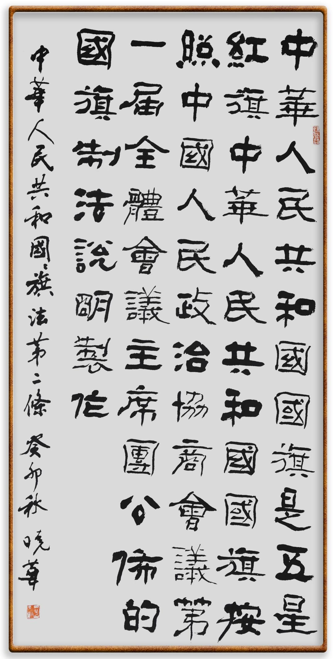 中華人民共和國(guó)國(guó)旗按照中國(guó)人民政治協(xié)商會(huì)議第一屆全體會(huì)議主席團(tuán)公布的國(guó)旗制法說(shuō)明制作。