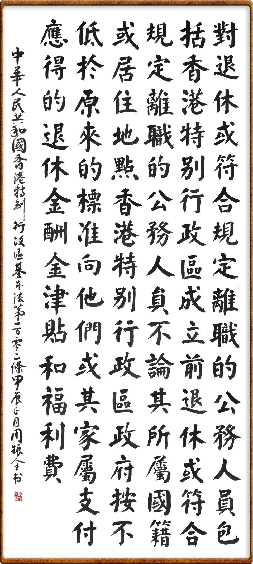 香港基本法第一百零二條 對退休或符合規(guī)定離職的公務(wù)人員,包括香港特別行政區(qū)成立前退休或符合規(guī)定離職的公務(wù)人員,不論其所屬國籍或居住地點,香港特別行政區(qū)政府按不低于原來的標準向他們或其家屬支付應(yīng)得的退休金、酬金、津貼和福利費。