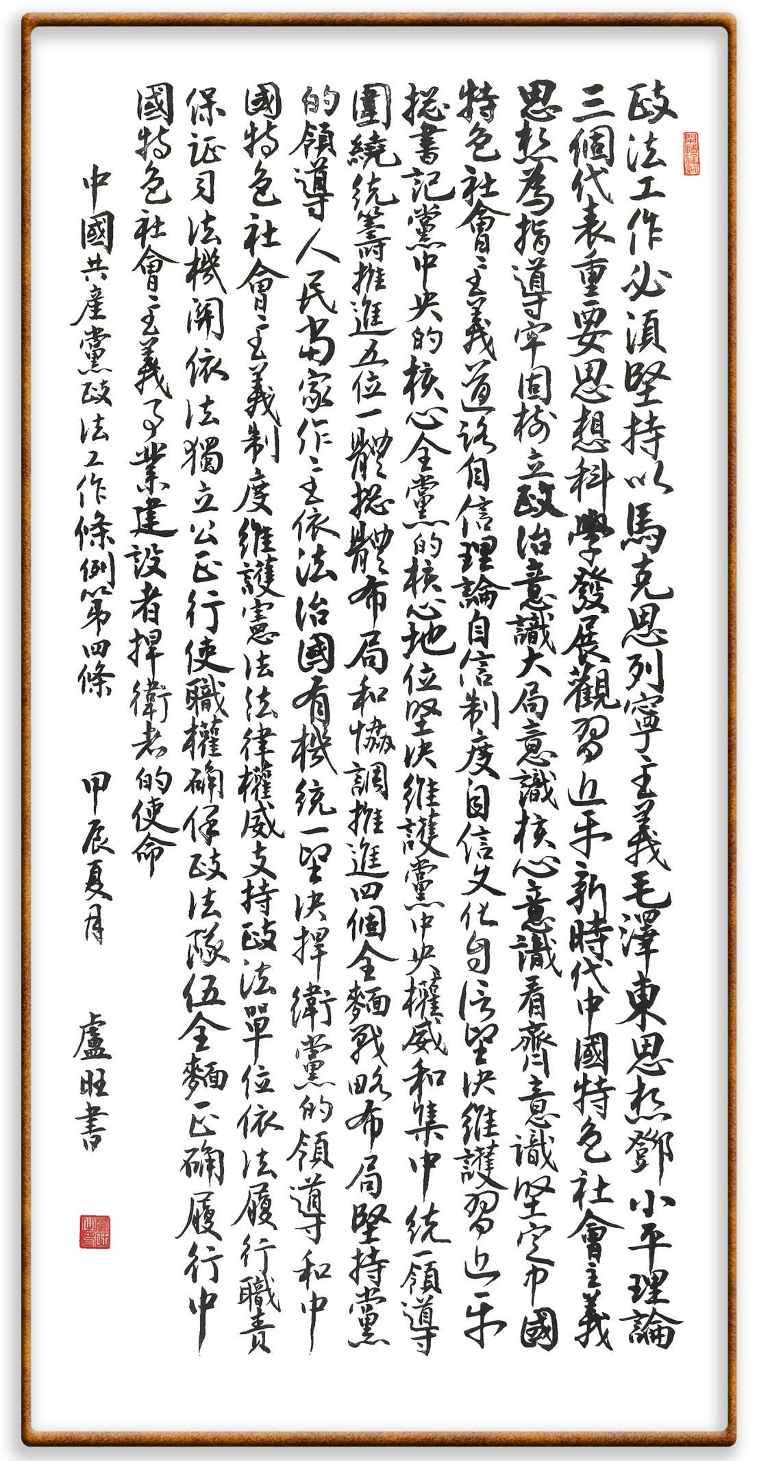 《中國(guó)共產(chǎn)黨政法工作條例》對(duì)黨領(lǐng)導(dǎo)新時(shí)代政法工作進(jìn)行全面制度擘畫(huà),為黨領(lǐng)導(dǎo)政法工作提供基本遵循,具有重大而深遠(yuǎn)的意義。為學(xué)習(xí)好、宣傳好、貫徹好、實(shí)施好這部黨內(nèi)法規(guī),繼《中華人民共和國(guó)民法典》《中華人民共和國(guó)憲法》《信訪工作條例》《中華人民共和國(guó)澳門(mén)特別行政區(qū)基本法》《中華人民共和國(guó)香港特別行政區(qū)基本法》等法律法規(guī)之后,“書(shū)·法”系列活動(dòng)將筆端對(duì)準(zhǔn)《中國(guó)共產(chǎn)黨政法工作條例》。