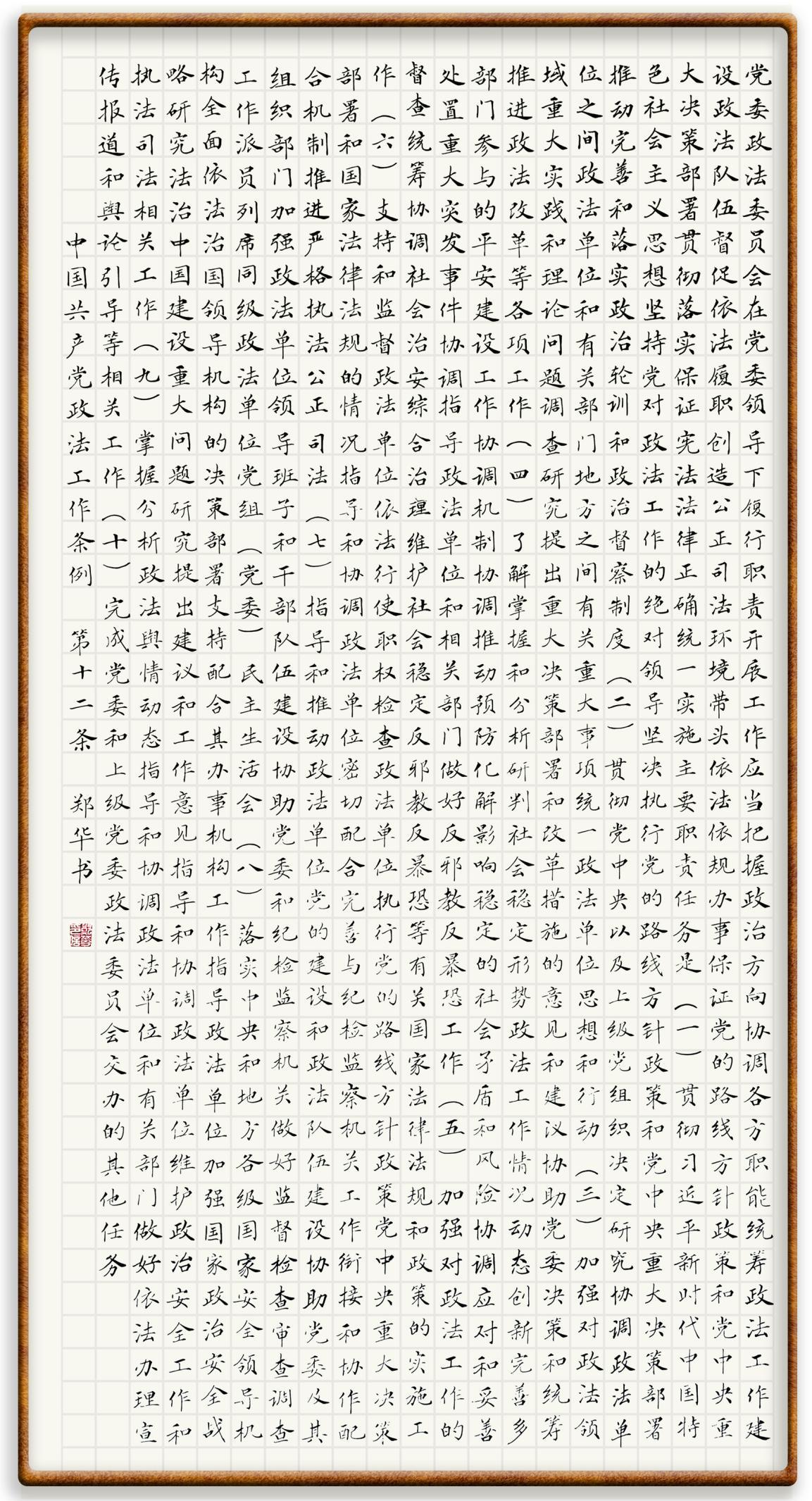 《中國共產(chǎn)黨政法工作條例》對黨領(lǐng)導(dǎo)新時代政法工作進(jìn)行全面制度擘畫,為黨領(lǐng)導(dǎo)政法工作提供基本遵循,具有重大而深遠(yuǎn)的意義。為學(xué)習(xí)好、宣傳好、貫徹好、實施好這部黨內(nèi)法規(guī),繼《中華人民共和國民法典》《中華人民共和國憲法》《信訪工作條例》《中華人民共和國澳門特別行政區(qū)基本法》《中華人民共和國香港特別行政區(qū)基本法》等法律法規(guī)之后,“書·法”系列活動將筆端對準(zhǔn)《中國共產(chǎn)黨政法工作條例》。