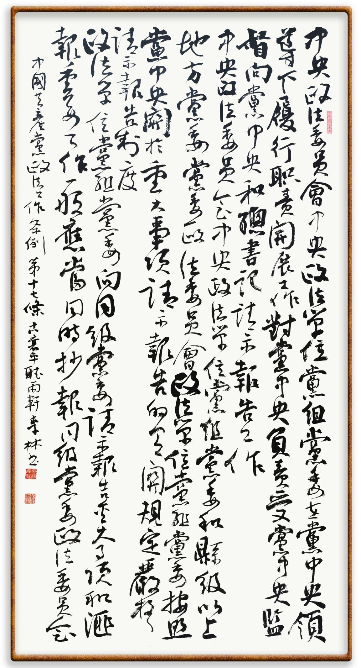 《中國共產(chǎn)黨政法工作條例》對黨領(lǐng)導新時代政法工作進行全面制度擘畫,為黨領(lǐng)導政法工作提供基本遵循,具有重大而深遠的意義。為學習好、宣傳好、貫徹好、實施好這部黨內(nèi)法規(guī),繼《中華人民共和國民法典》《中華人民共和國憲法》《信訪工作條例》《中華人民共和國澳門特別行政區(qū)基本法》《中華人民共和國香港特別行政區(qū)基本法》等法律法規(guī)之后,“書·法”系列活動將筆端對準《中國共產(chǎn)黨政法工作條例》。