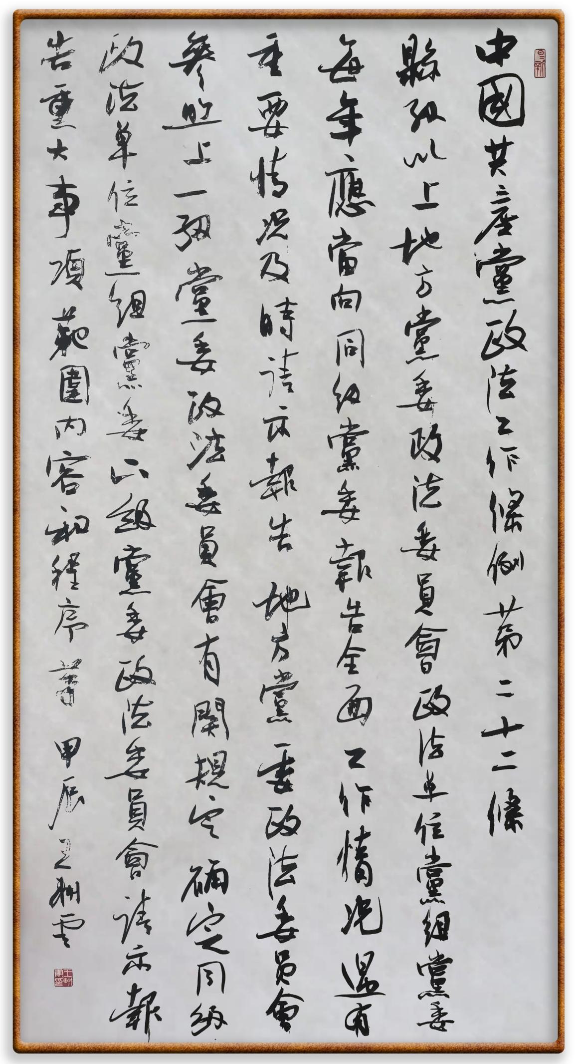 《中國(guó)共產(chǎn)黨政法工作條例》對(duì)黨領(lǐng)導(dǎo)新時(shí)代政法工作進(jìn)行全面制度擘畫(huà),為黨領(lǐng)導(dǎo)政法工作提供基本遵循,具有重大而深遠(yuǎn)的意義。為學(xué)習(xí)好、宣傳好、貫徹好、實(shí)施好這部黨內(nèi)法規(guī),繼《中華人民共和國(guó)民法典》《中華人民共和國(guó)憲法》《信訪工作條例》《中華人民共和國(guó)澳門特別行政區(qū)基本法》《中華人民共和國(guó)香港特別行政區(qū)基本法》等法律法規(guī)之后,“書(shū)·法”系列活動(dòng)將筆端對(duì)準(zhǔn)《中國(guó)共產(chǎn)黨政法工作條例》。