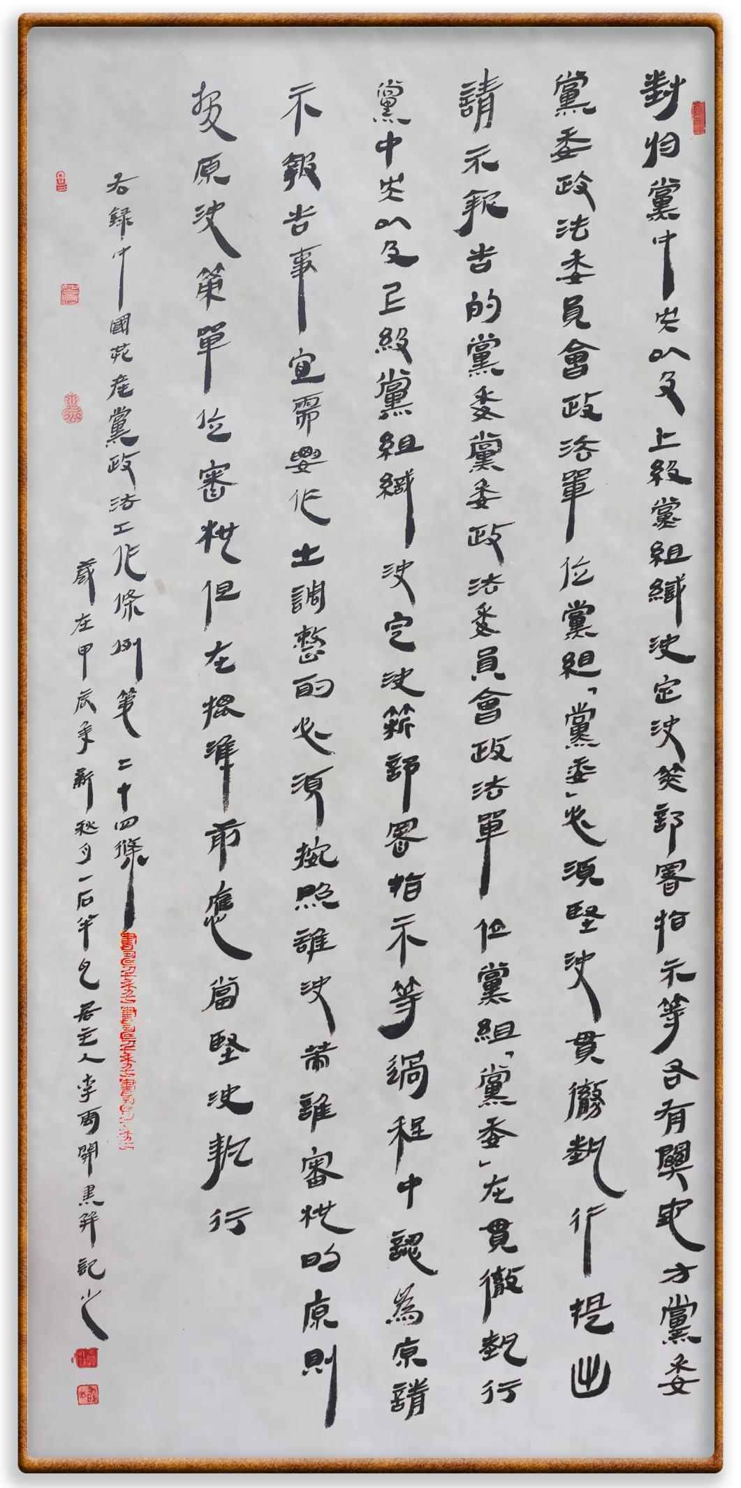 《中國共產(chǎn)黨政法工作條例》對(duì)黨領(lǐng)導(dǎo)新時(shí)代政法工作進(jìn)行全面制度擘畫,為黨領(lǐng)導(dǎo)政法工作提供基本遵循,具有重大而深遠(yuǎn)的意義。為學(xué)習(xí)好、宣傳好、貫徹好、實(shí)施好這部黨內(nèi)法規(guī),繼《中華人民共和國民法典》《中華人民共和國憲法》《信訪工作條例》《中華人民共和國澳門特別行政區(qū)基本法》《中華人民共和國香港特別行政區(qū)基本法》等法律法規(guī)之后,“書·法”系列活動(dòng)將筆端對(duì)準(zhǔn)《中國共產(chǎn)黨政法工作條例》。