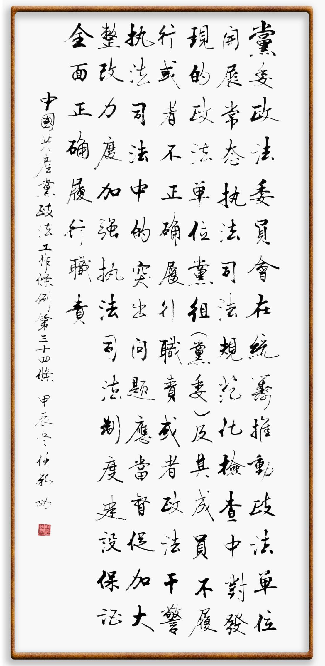 《中國共產(chǎn)黨政法工作條例》對黨領導新時代政法工作進行全面制度擘畫,為黨領導政法工作提供基本遵循,具有重大而深遠的意義。為學習好、宣傳好、貫徹好、實施好這部黨內(nèi)法規(guī),繼《中華人民共和國民法典》《中華人民共和國憲法》《信訪工作條例》《中華人民共和國澳門特別行政區(qū)基本法》《中華人民共和國香港特別行政區(qū)基本法》等法律法規(guī)之后,“書·法”系列活動將筆端對準《中國共產(chǎn)黨政法工作條例》。