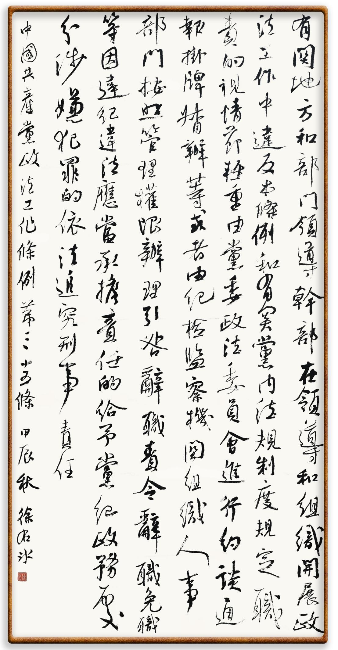 《中國共產(chǎn)黨政法工作條例》對黨領(lǐng)導新時代政法工作進行全面制度擘畫,為黨領(lǐng)導政法工作提供基本遵循,具有重大而深遠的意義。為學習好、宣傳好、貫徹好、實施好這部黨內(nèi)法規(guī),繼《中華人民共和國民法典》《中華人民共和國憲法》《信訪工作條例》《中華人民共和國澳門特別行政區(qū)基本法》《中華人民共和國香港特別行政區(qū)基本法》等法律法規(guī)之后,“書·法”系列活動將筆端對準《中國共產(chǎn)黨政法工作條例》。