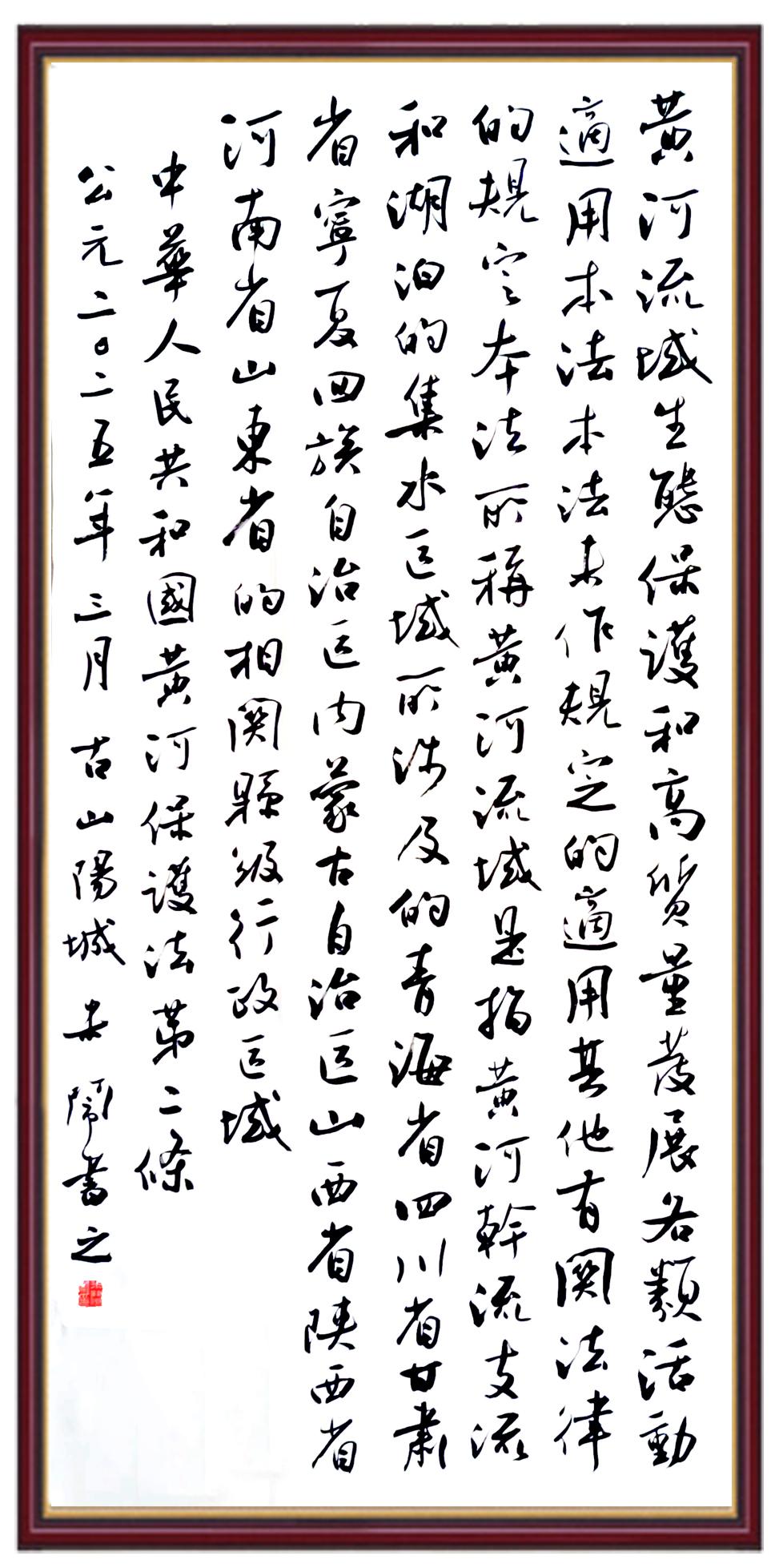 黃河寧,天下平。黃河是中華民族的發(fā)源地和搖籃,保護(hù)黃河是事關(guān)中華民族偉大復(fù)興的千秋大計(jì)?!吨腥A人民共和國(guó)黃河保護(hù)法》為推進(jìn)水資源節(jié)約集約利用、保護(hù)傳承弘揚(yáng)黃河文化、推動(dòng)黃河流域生態(tài)保護(hù)和高質(zhì)量發(fā)展提供了有力法治保障。繼書(shū)寫(xiě)《中華人民共和國(guó)民法典》《中華人民共和國(guó)憲法》《中華人民共和國(guó)澳門(mén)特別行政區(qū)基本法》《中華人民共和國(guó)香港特別行政區(qū)基本法》《中華人民共和國(guó)國(guó)旗法》《中華人民共和國(guó)國(guó)徽法》《中華人民共和國(guó)國(guó)歌法》《中華人民共和國(guó)法官法》等法律法規(guī)之后,法制日?qǐng)?bào)社聯(lián)合沿黃九?。▍^(qū))司法廳、書(shū)法家協(xié)會(huì),將筆端對(duì)準(zhǔn)《中華人民共和國(guó)黃河保護(hù)法》。