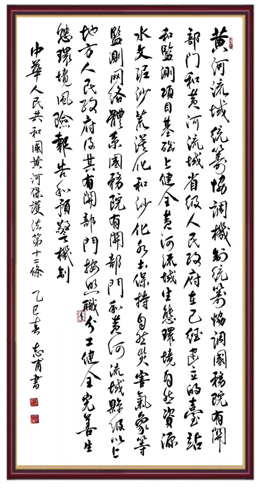 黃河寧,天下平。黃河是中華民族的發(fā)源地和搖籃,保護(hù)黃河是事關(guān)中華民族偉大復(fù)興的千秋大計(jì)?!吨腥A人民共和國(guó)黃河保護(hù)法》為推進(jìn)水資源節(jié)約集約利用、保護(hù)傳承弘揚(yáng)黃河文化、推動(dòng)黃河流域生態(tài)保護(hù)和高質(zhì)量發(fā)展提供了有力法治保障。繼書(shū)寫(xiě)《中華人民共和國(guó)民法典》《中華人民共和國(guó)憲法》《中華人民共和國(guó)澳門(mén)特別行政區(qū)基本法》《中華人民共和國(guó)香港特別行政區(qū)基本法》《中華人民共和國(guó)國(guó)旗法》《中華人民共和國(guó)國(guó)徽法》《中華人民共和國(guó)國(guó)歌法》《中華人民共和國(guó)法官法》等法律法規(guī)之后,法制日?qǐng)?bào)社聯(lián)合沿黃九?。▍^(qū))司法廳、書(shū)法家協(xié)會(huì),將筆端對(duì)準(zhǔn)《中華人民共和國(guó)黃河保護(hù)法》。