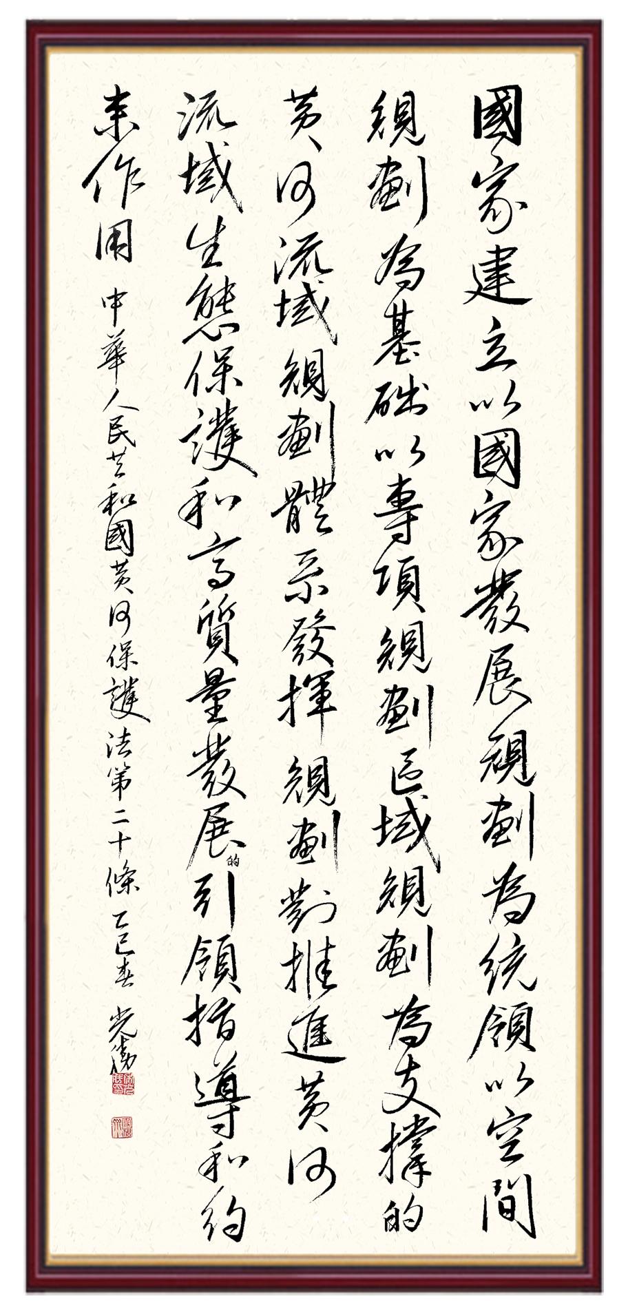 黃河寧,天下平。黃河是中華民族的發(fā)源地和搖籃,保護(hù)黃河是事關(guān)中華民族偉大復(fù)興的千秋大計(jì)?!吨腥A人民共和國黃河保護(hù)法》為推進(jìn)水資源節(jié)約集約利用、保護(hù)傳承弘揚(yáng)黃河文化、推動(dòng)黃河流域生態(tài)保護(hù)和高質(zhì)量發(fā)展提供了有力法治保障。繼書寫《中華人民共和國民法典》《中華人民共和國憲法》《中華人民共和國澳門特別行政區(qū)基本法》《中華人民共和國香港特別行政區(qū)基本法》《中華人民共和國國旗法》《中華人民共和國國徽法》《中華人民共和國國歌法》《中華人民共和國法官法》等法律法規(guī)之后,法制日?qǐng)?bào)社聯(lián)合沿黃九省(區(qū))司法廳、書法家協(xié)會(huì),將筆端對(duì)準(zhǔn)《中華人民共和國黃河保護(hù)法》。