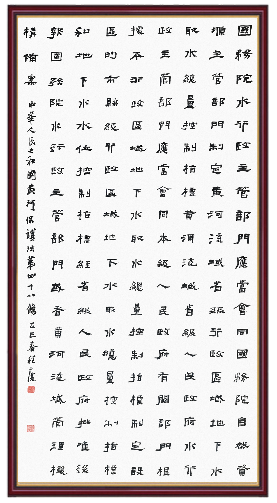 黃河寧,天下平。黃河是中華民族的發(fā)源地和搖籃,保護(hù)黃河是事關(guān)中華民族偉大復(fù)興的千秋大計(jì)?!吨腥A人民共和國(guó)黃河保護(hù)法》為推進(jìn)水資源節(jié)約集約利用、保護(hù)傳承弘揚(yáng)黃河文化、推動(dòng)黃河流域生態(tài)保護(hù)和高質(zhì)量發(fā)展提供了有力法治保障。繼書寫《中華人民共和國(guó)民法典》《中華人民共和國(guó)憲法》《中華人民共和國(guó)澳門特別行政區(qū)基本法》《中華人民共和國(guó)香港特別行政區(qū)基本法》《中華人民共和國(guó)國(guó)旗法》《中華人民共和國(guó)國(guó)徽法》《中華人民共和國(guó)國(guó)歌法》《中華人民共和國(guó)法官法》等法律法規(guī)之后,法制日?qǐng)?bào)社聯(lián)合沿黃九?。▍^(qū))司法廳、書法家協(xié)會(huì),將筆端對(duì)準(zhǔn)《中華人民共和國(guó)黃河保護(hù)法》。