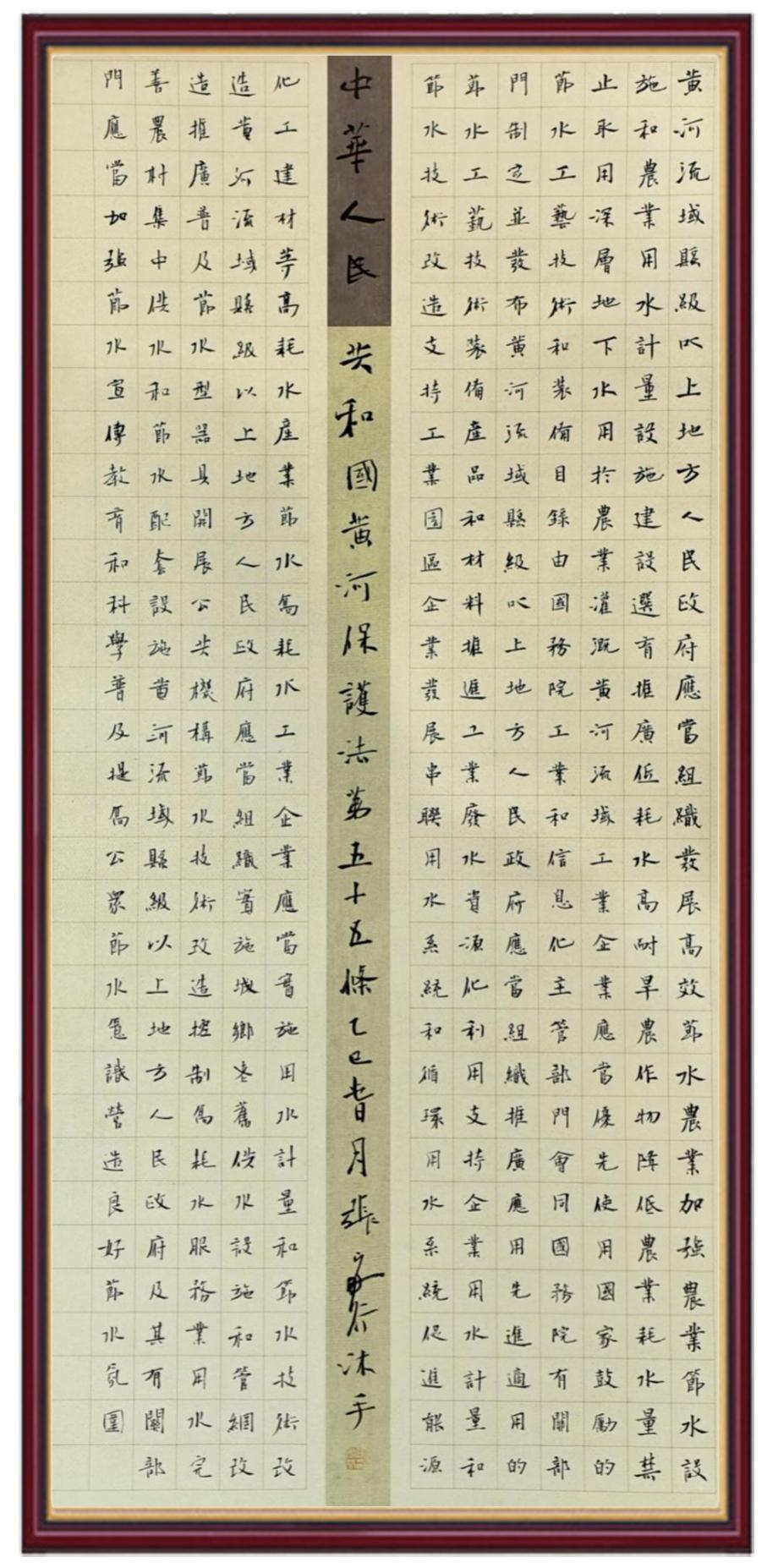 黃河寧,天下平。黃河是中華民族的發(fā)源地和搖籃,保護(hù)黃河是事關(guān)中華民族偉大復(fù)興的千秋大計?!吨腥A人民共和國黃河保護(hù)法》為推進(jìn)水資源節(jié)約集約利用、保護(hù)傳承弘揚黃河文化、推動黃河流域生態(tài)保護(hù)和高質(zhì)量發(fā)展提供了有力法治保障。繼書寫《中華人民共和國民法典》《中華人民共和國憲法》《中華人民共和國澳門特別行政區(qū)基本法》《中華人民共和國香港特別行政區(qū)基本法》《中華人民共和國國旗法》《中華人民共和國國徽法》《中華人民共和國國歌法》《中華人民共和國法官法》等法律法規(guī)之后,法制日報社聯(lián)合沿黃九?。▍^(qū))司法廳、書法家協(xié)會,將筆端對準(zhǔn)《中華人民共和國黃河保護(hù)法》。