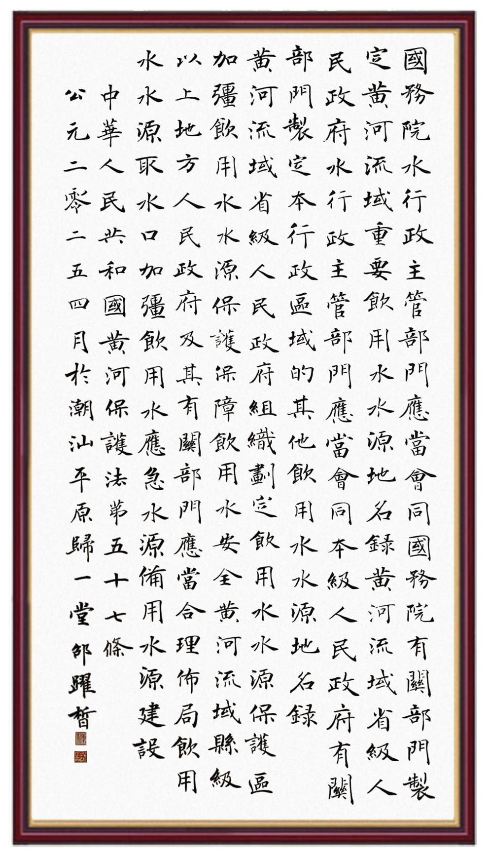 黃河寧,天下平。黃河是中華民族的發(fā)源地和搖籃,保護黃河是事關中華民族偉大復興的千秋大計?!吨腥A人民共和國黃河保護法》為推進水資源節(jié)約集約利用、保護傳承弘揚黃河文化、推動黃河流域生態(tài)保護和高質(zhì)量發(fā)展提供了有力法治保障。繼書寫《中華人民共和國民法典》《中華人民共和國憲法》《中華人民共和國澳門特別行政區(qū)基本法》《中華人民共和國香港特別行政區(qū)基本法》《中華人民共和國國旗法》《中華人民共和國國徽法》《中華人民共和國國歌法》《中華人民共和國法官法》等法律法規(guī)之后,法制日報社聯(lián)合沿黃九?。▍^(qū))司法廳、書法家協(xié)會,將筆端對準《中華人民共和國黃河保護法》。