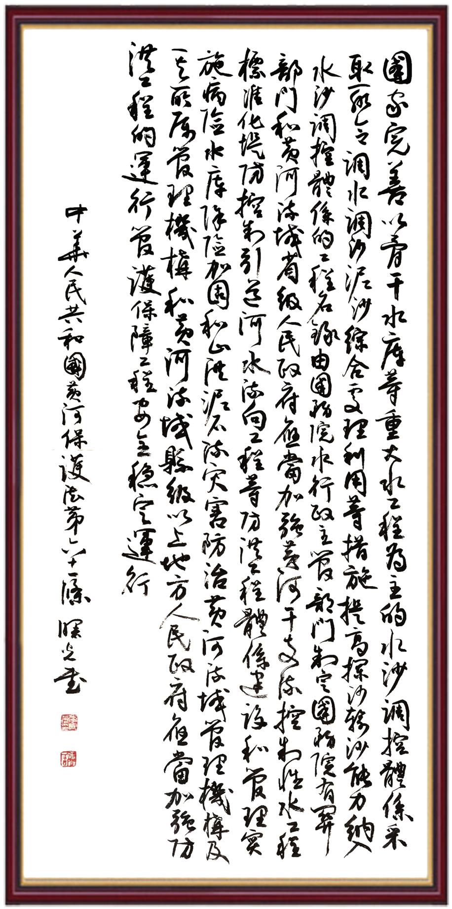 黃河寧,天下平。黃河是中華民族的發(fā)源地和搖籃,保護黃河是事關(guān)中華民族偉大復(fù)興的千秋大計。《中華人民共和國黃河保護法》為推進水資源節(jié)約集約利用、保護傳承弘揚黃河文化、推動黃河流域生態(tài)保護和高質(zhì)量發(fā)展提供了有力法治保障。繼書寫《中華人民共和國民法典》《中華人民共和國憲法》《中華人民共和國澳門特別行政區(qū)基本法》《中華人民共和國香港特別行政區(qū)基本法》《中華人民共和國國旗法》《中華人民共和國國徽法》《中華人民共和國國歌法》《中華人民共和國法官法》等法律法規(guī)之后,法制日報社聯(lián)合沿黃九?。▍^(qū))司法廳、書法家協(xié)會,將筆端對準《中華人民共和國黃河保護法》。