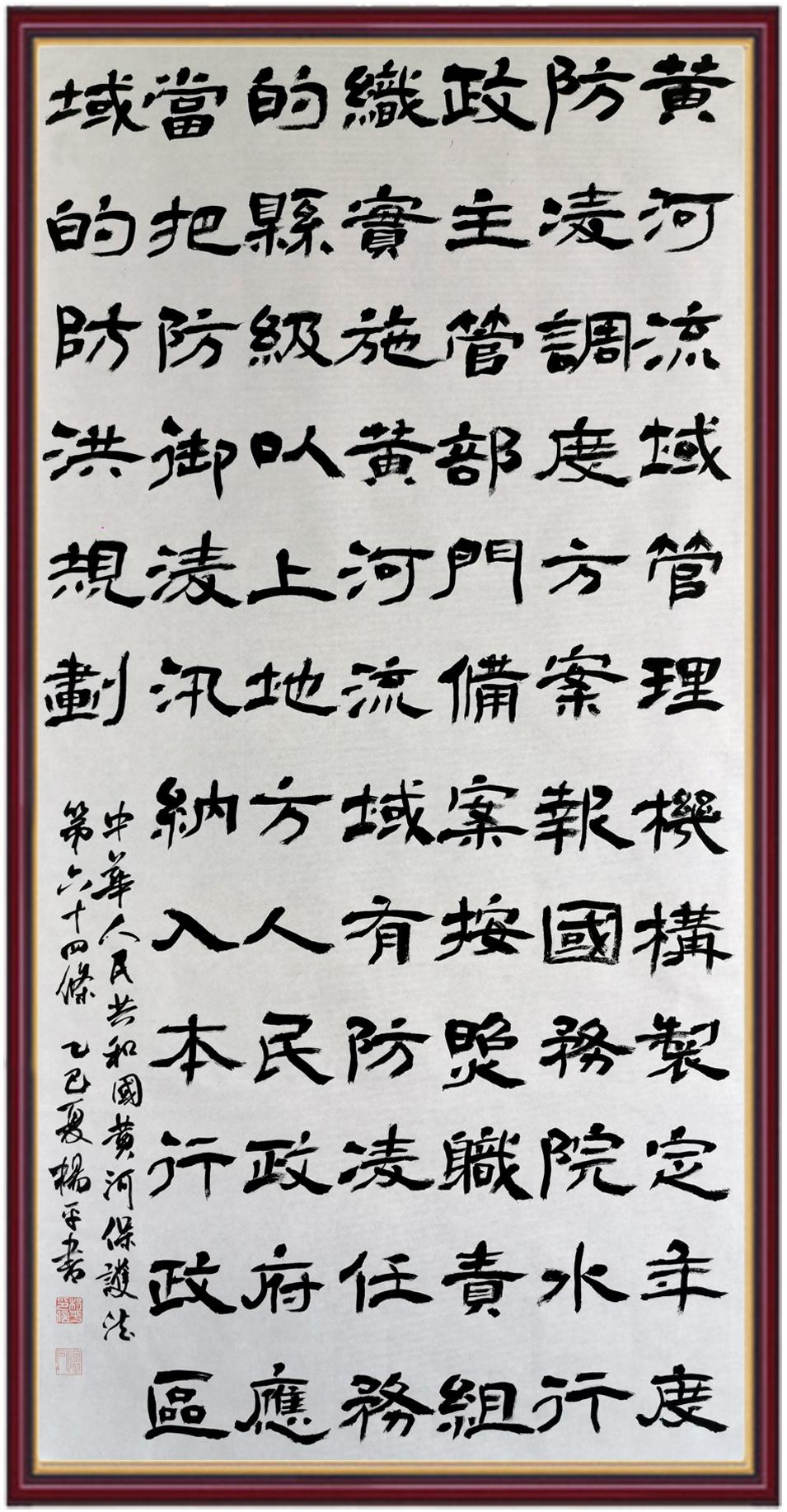 黃河寧,天下平。黃河是中華民族的發(fā)源地和搖籃,保護(hù)黃河是事關(guān)中華民族偉大復(fù)興的千秋大計(jì)?!吨腥A人民共和國(guó)黃河保護(hù)法》為推進(jìn)水資源節(jié)約集約利用、保護(hù)傳承弘揚(yáng)黃河文化、推動(dòng)黃河流域生態(tài)保護(hù)和高質(zhì)量發(fā)展提供了有力法治保障。繼書寫《中華人民共和國(guó)民法典》《中華人民共和國(guó)憲法》《中華人民共和國(guó)澳門特別行政區(qū)基本法》《中華人民共和國(guó)香港特別行政區(qū)基本法》《中華人民共和國(guó)國(guó)旗法》《中華人民共和國(guó)國(guó)徽法》《中華人民共和國(guó)國(guó)歌法》《中華人民共和國(guó)法官法》等法律法規(guī)之后,法制日?qǐng)?bào)社聯(lián)合沿黃九省(區(qū))司法廳、書法家協(xié)會(huì),將筆端對(duì)準(zhǔn)《中華人民共和國(guó)黃河保護(hù)法》。