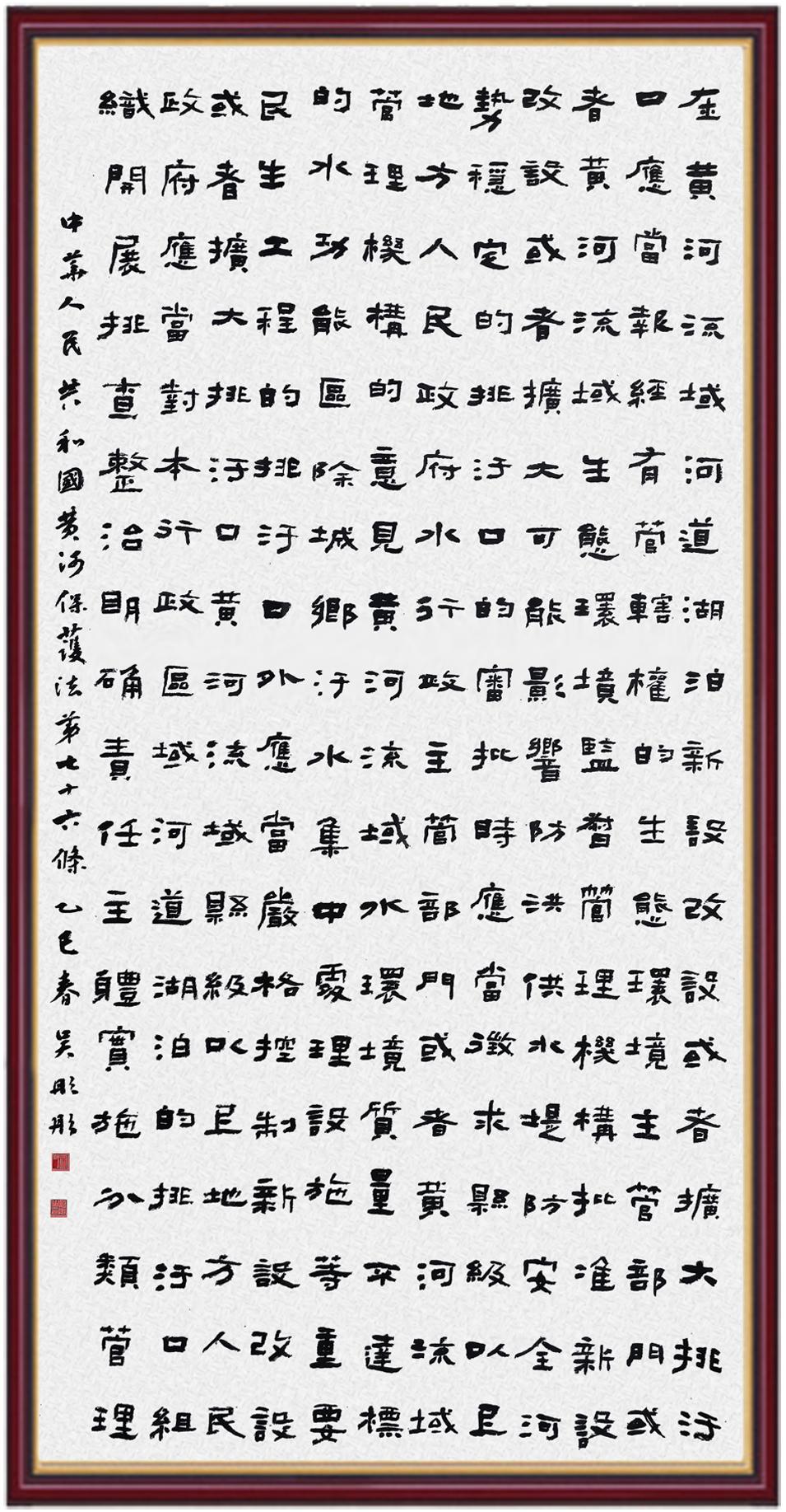 黃河寧,天下平。黃河是中華民族的發(fā)源地和搖籃,保護(hù)黃河是事關(guān)中華民族偉大復(fù)興的千秋大計(jì)。《中華人民共和國黃河保護(hù)法》為推進(jìn)水資源節(jié)約集約利用、保護(hù)傳承弘揚(yáng)黃河文化、推動(dòng)黃河流域生態(tài)保護(hù)和高質(zhì)量發(fā)展提供了有力法治保障。繼書寫《中華人民共和國民法典》《中華人民共和國憲法》《中華人民共和國澳門特別行政區(qū)基本法》《中華人民共和國香港特別行政區(qū)基本法》《中華人民共和國國旗法》《中華人民共和國國徽法》《中華人民共和國國歌法》《中華人民共和國法官法》等法律法規(guī)之后,法制日報(bào)社聯(lián)合沿黃九?。▍^(qū))司法廳、書法家協(xié)會(huì),將筆端對準(zhǔn)《中華人民共和國黃河保護(hù)法》。