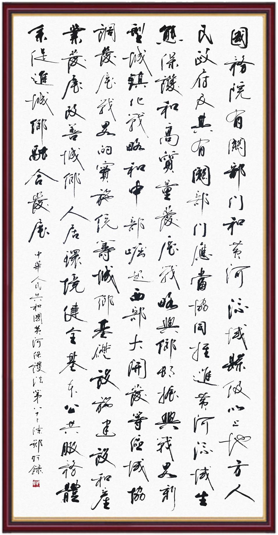 黃河寧,天下平。黃河是中華民族的發(fā)源地和搖籃,保護(hù)黃河是事關(guān)中華民族偉大復(fù)興的千秋大計(jì)?!吨腥A人民共和國黃河保護(hù)法》為推進(jìn)水資源節(jié)約集約利用、保護(hù)傳承弘揚(yáng)黃河文化、推動黃河流域生態(tài)保護(hù)和高質(zhì)量發(fā)展提供了有力法治保障。繼書寫《中華人民共和國民法典》《中華人民共和國憲法》《中華人民共和國澳門特別行政區(qū)基本法》《中華人民共和國香港特別行政區(qū)基本法》《中華人民共和國國旗法》《中華人民共和國國徽法》《中華人民共和國國歌法》《中華人民共和國法官法》等法律法規(guī)之后,法制日報社聯(lián)合沿黃九省(區(qū))司法廳、書法家協(xié)會,將筆端對準(zhǔn)《中華人民共和國黃河保護(hù)法》。