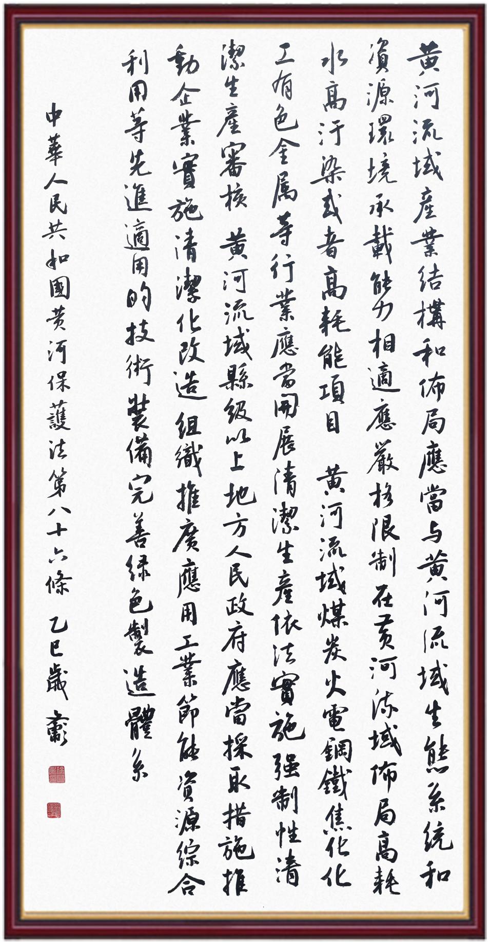 黃河寧,天下平。黃河是中華民族的發(fā)源地和搖籃,保護(hù)黃河是事關(guān)中華民族偉大復(fù)興的千秋大計(jì)。《中華人民共和國黃河保護(hù)法》為推進(jìn)水資源節(jié)約集約利用、保護(hù)傳承弘揚(yáng)黃河文化、推動(dòng)黃河流域生態(tài)保護(hù)和高質(zhì)量發(fā)展提供了有力法治保障。繼書寫《中華人民共和國民法典》《中華人民共和國憲法》《中華人民共和國澳門特別行政區(qū)基本法》《中華人民共和國香港特別行政區(qū)基本法》《中華人民共和國國旗法》《中華人民共和國國徽法》《中華人民共和國國歌法》《中華人民共和國法官法》等法律法規(guī)之后,法制日報(bào)社聯(lián)合沿黃九省(區(qū))司法廳、書法家協(xié)會(huì),將筆端對準(zhǔn)《中華人民共和國黃河保護(hù)法》。