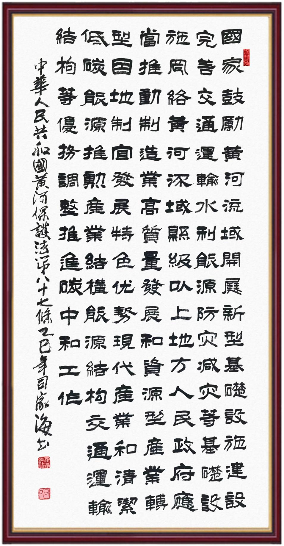 黃河寧,天下平。黃河是中華民族的發(fā)源地和搖籃,保護(hù)黃河是事關(guān)中華民族偉大復(fù)興的千秋大計(jì)?!吨腥A人民共和國(guó)黃河保護(hù)法》為推進(jìn)水資源節(jié)約集約利用、保護(hù)傳承弘揚(yáng)黃河文化、推動(dòng)黃河流域生態(tài)保護(hù)和高質(zhì)量發(fā)展提供了有力法治保障。繼書(shū)寫(xiě)《中華人民共和國(guó)民法典》《中華人民共和國(guó)憲法》《中華人民共和國(guó)澳門(mén)特別行政區(qū)基本法》《中華人民共和國(guó)香港特別行政區(qū)基本法》《中華人民共和國(guó)國(guó)旗法》《中華人民共和國(guó)國(guó)徽法》《中華人民共和國(guó)國(guó)歌法》《中華人民共和國(guó)法官法》等法律法規(guī)之后,法制日?qǐng)?bào)社聯(lián)合沿黃九?。▍^(qū))司法廳、書(shū)法家協(xié)會(huì),將筆端對(duì)準(zhǔn)《中華人民共和國(guó)黃河保護(hù)法》。